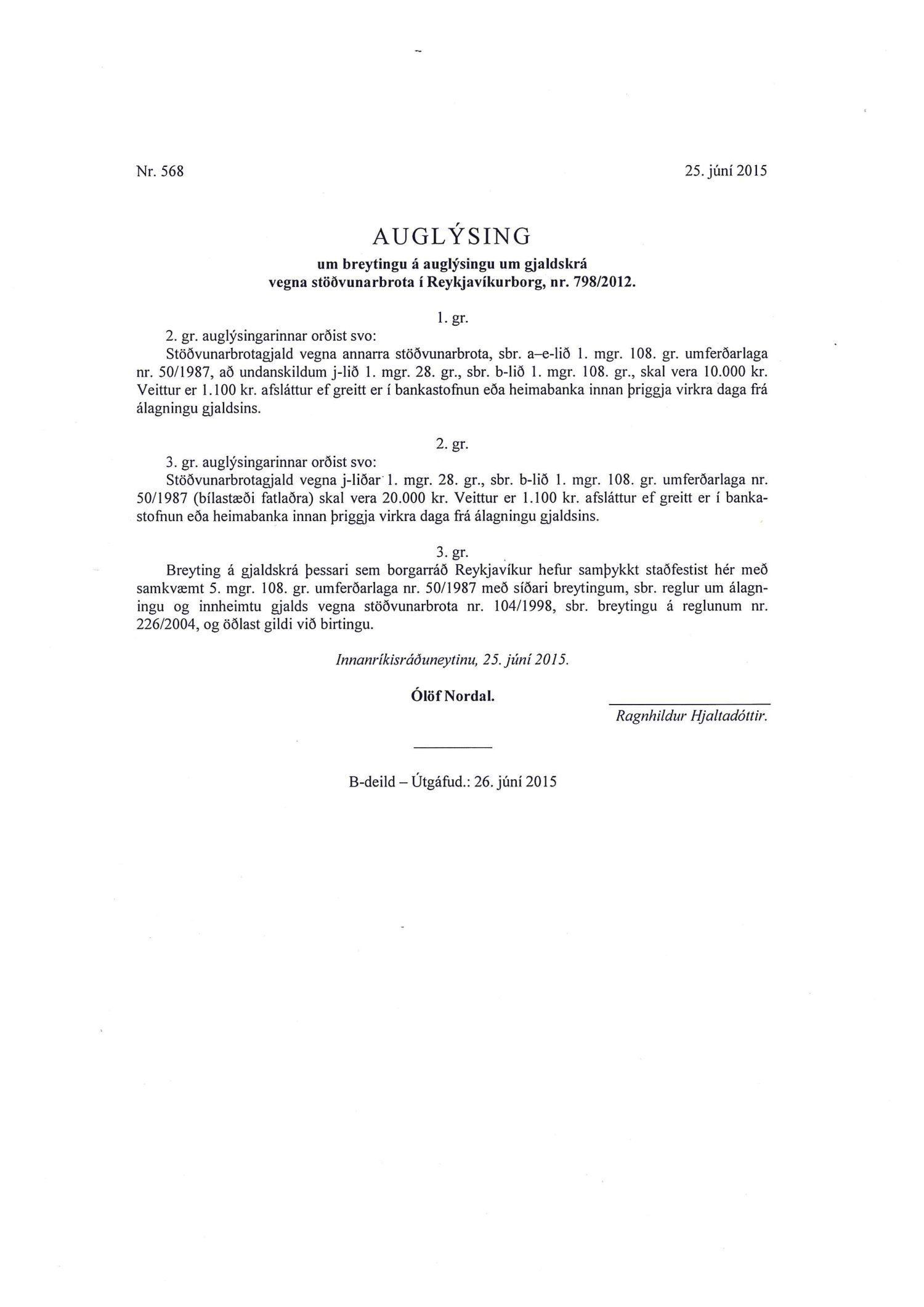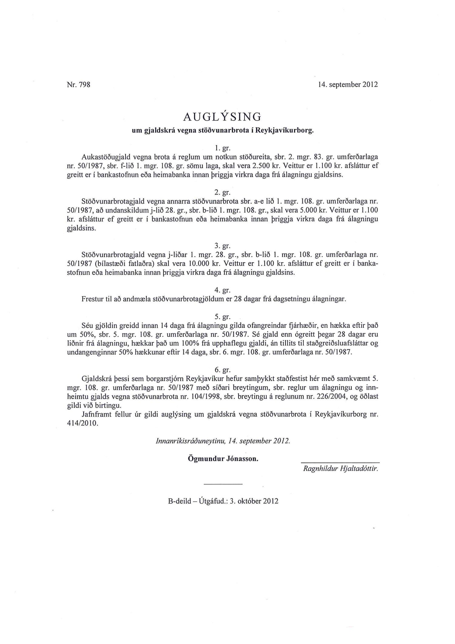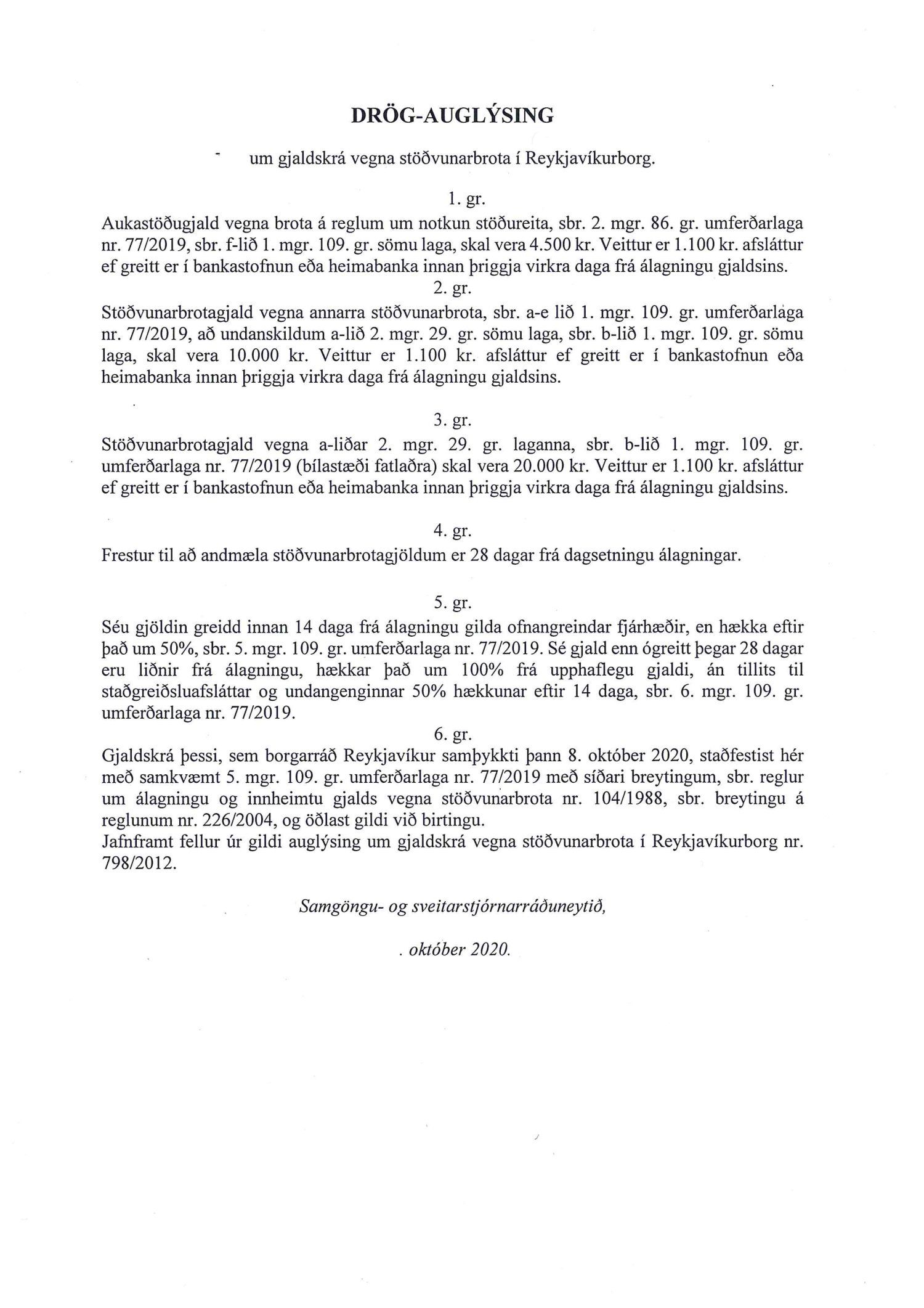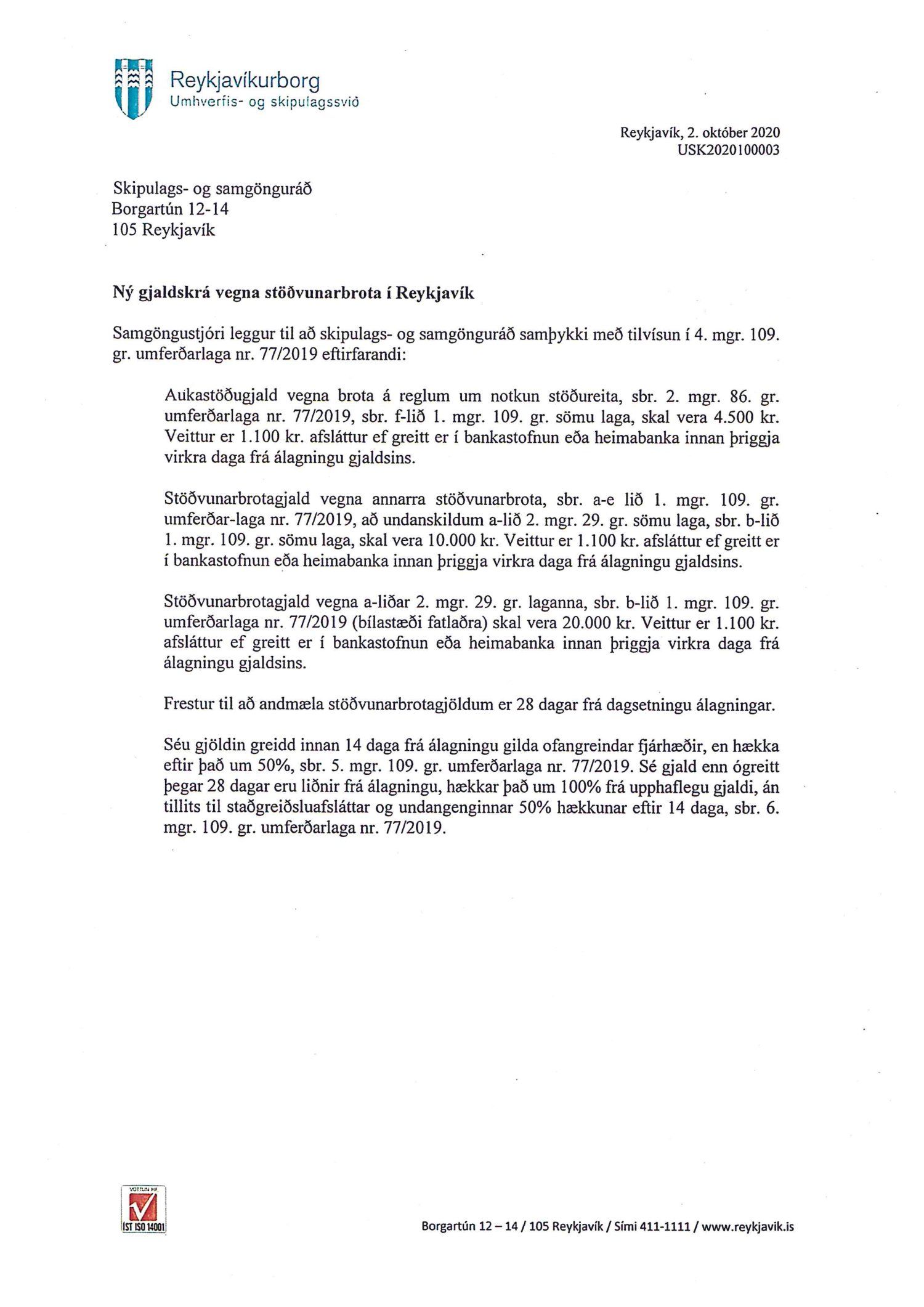 Samgöngustjóri leggur til að skipulags- og samgönguráð samþykki með tilvísun í 4. mgr. 109. gr. umferðarlaga nr. 77/2019 eftirfarandi: Aukastöðugjald vegna brota á reglum um notkun stöðureita, sbr. 2. mgr. 86. gr. umferðarlaga nr. 77/2019, sbr. f-lið 1. mgr. 109. gr. sömu laga, skal vera 4.500 kr. Veittur er 1.100 kr. afsláttur ef greitt er í bankastofnun eða heimabanka innan þriggja virkra daga frá álagningu gjaldsins. Stöðvunarbrotagjald vegna annarra stöðvunarbrota, sbr. a-e lið 1. mgr. 109. gr. umferðar-laga nr. 77/2019, að undanskildum a-lið 2. mgr. 29. gr. sömu laga, sbr. b-lið 1. mgr. 109. gr. sömu laga, skal vera 10.000 kr. Veittur er 1.100 kr. afsláttur ef greitt er í bankastofnun eða heimabanka innan þriggja virkra daga frá álagningu gjaldsins. Stöðvunarbrotagjald vegna a-liðar 2. mgr. 29. gr. laganna, sbr. b-lið 1. mgr. 109. gr. umferðarlaga nr. 77/2019 (bílastæði fatlaðra) skal vera 20.000 kr. Veittur er 1.100 kr. afsláttur ef greitt er í bankastofnun eða heimabanka innan þriggja virkra daga frá álagningu gjaldsins. Frestur til að andmæla stöðvunarbrotagjöldum er 28 dagar frá dagsetningu álagningar. Séu gjöldin greidd innan 14 daga frá álagningu gilda ofangreindar fjárhæðir, en hækka eftir það um 50%, sbr. 5. mgr. 109. gr. umferðarlaga nr. 77/2019. Sé gjald enn ógreitt þegar 28 dagar eru liðnir frá álagningu, hækkar það um 100% frá upphaflegu gjaldi, án tillits til staðgreiðsluafsláttar og undangenginnar 50% hækkunar eftir 14 daga, sbr. 6. mgr. 109. gr. umferðarlaga nr. 77/2019.