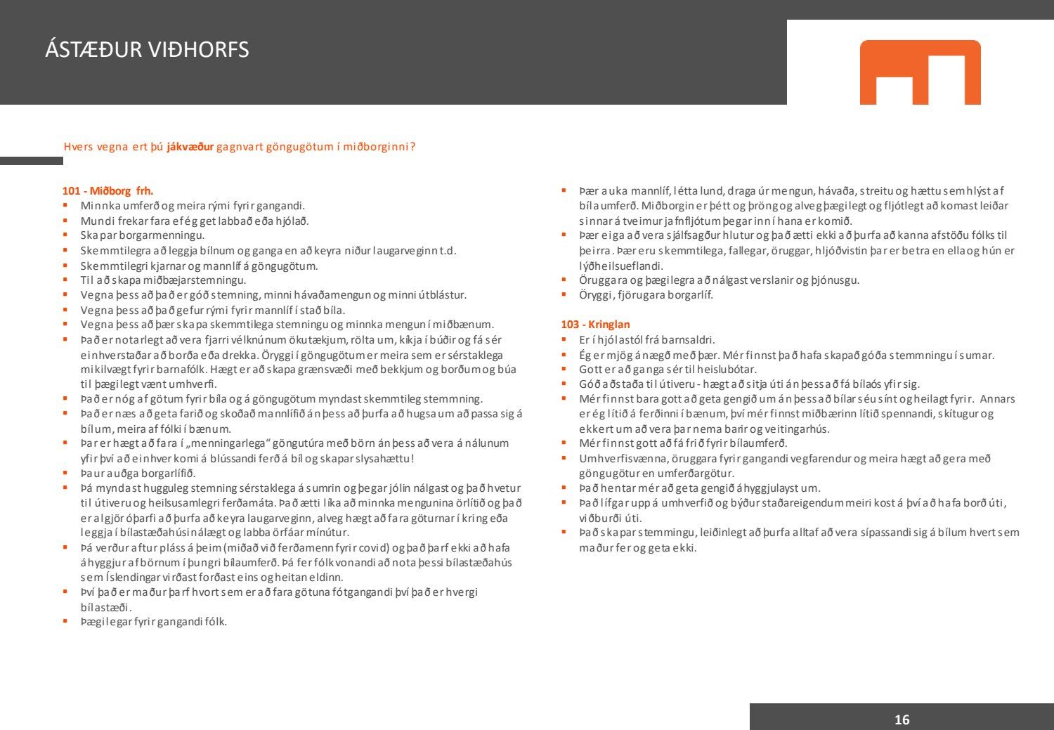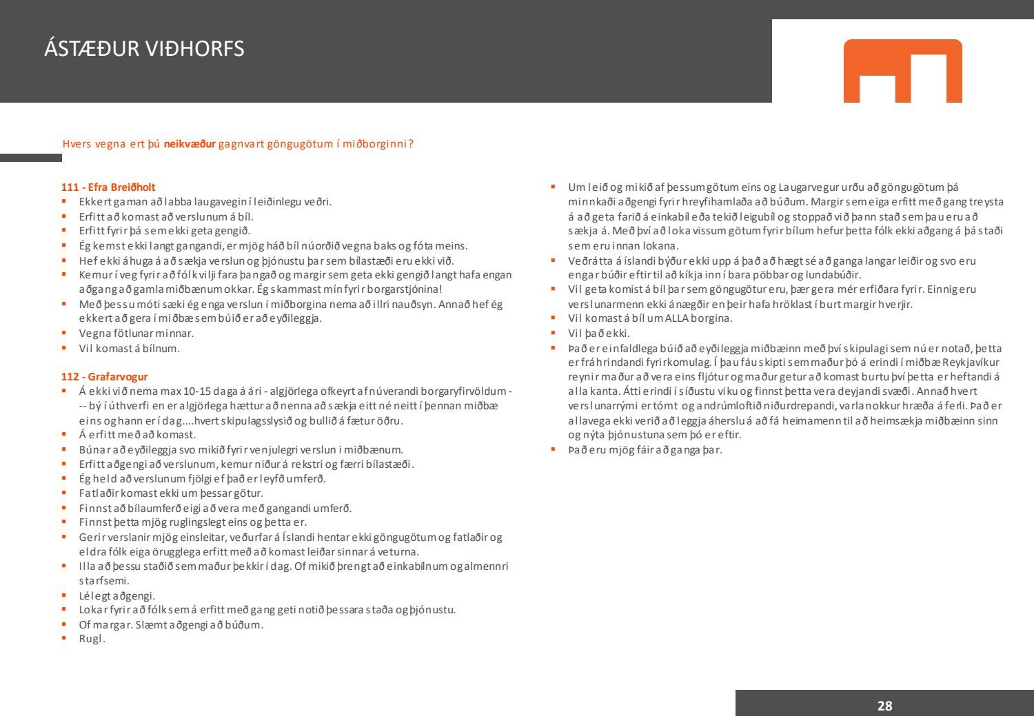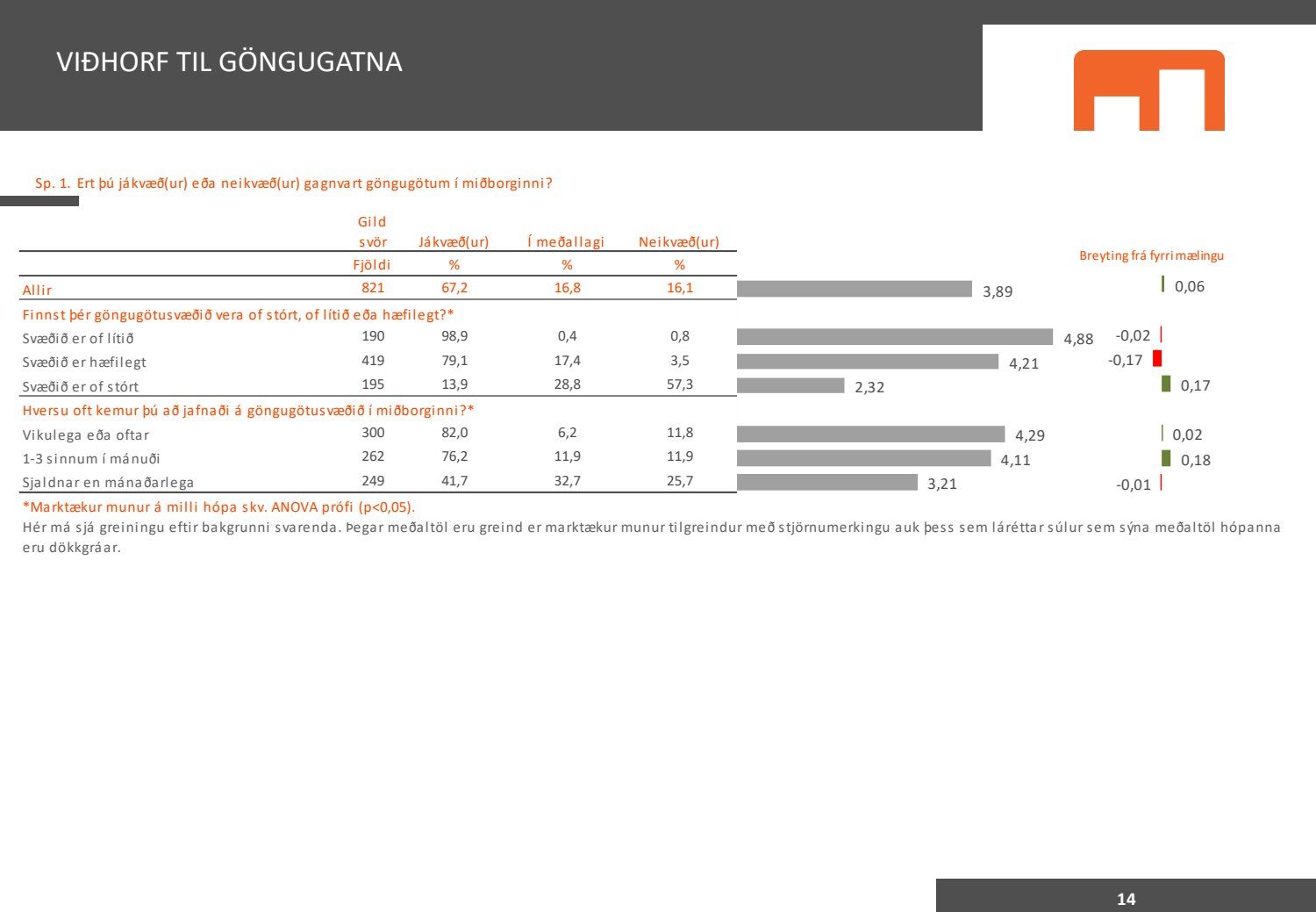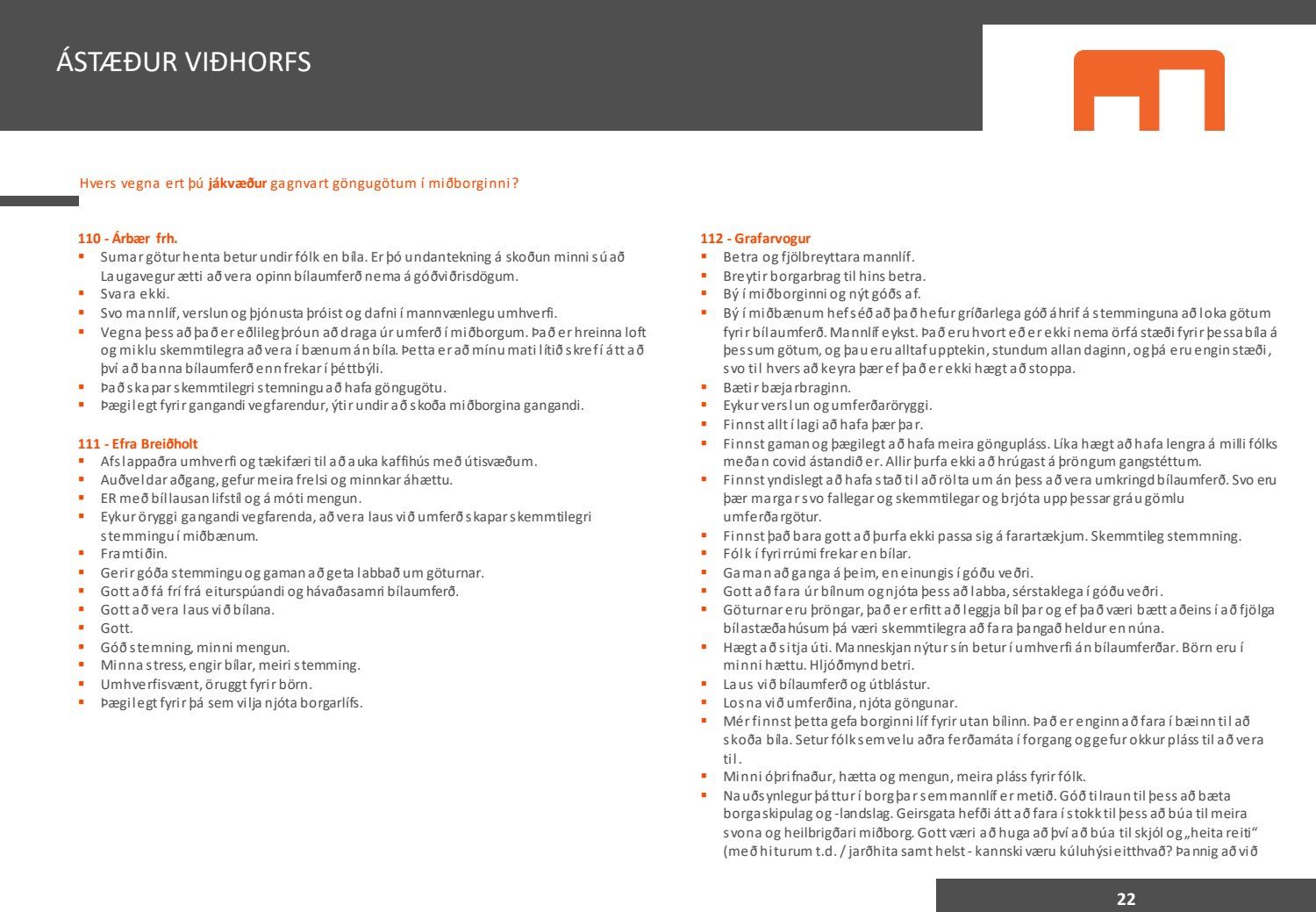 Viðhorfið sem birtist í könnuninni endurspeglar greinilega ekki viðhorf fólks sem er miður því maður vill gjarnan geta stuðst við kannanir að einhverju leyti. Kynningin gefur þá mynd að allir séu í raun húrrandi glaðir yfir ástandinu í bænum. Ef fulltrúi Flokks fólksins væri spurður hvað honum þætti almennt um göngugötur væri svarið að þær væru frábærar þar sem þær ættu við og þjónuðu sínum tilgangi. Ef horft er til göngugatna í miðbænum sem leiddu til lokunar umferðar hafa margir stigið fram og lýst óánægju sinni. Ekki síst hagaðilar sem hættu að fá til sín kúnna í sama mæli og áður. Fólk sem kom á svæðið er hætt að koma. Það vita það allir sem vilja hvernig komið er fyrir Laugavegi. Nú nýlega steig eigandi Máls og menningar fram og sagði að reksturinn hefði verið orðinn erfiður fyrir COVID. Sölutölurnar ljúga ekki og fylgja sölutölurnar lokunum gatna. Fólk sem ekki býr í nágrenninu kemur eðlilega minna þegar engar verslanir eru lengur á staðnum og aðgengi erfitt. Fulltrúi Flokks fólksins verður bara að vera heiðarlegur í þessu sambandi og segja að þessi könnun, niðurstöður hennar eru í ljósi alls þessa ekki trúverðugar eða í það minnsta gefur kynningin ranga mynd.