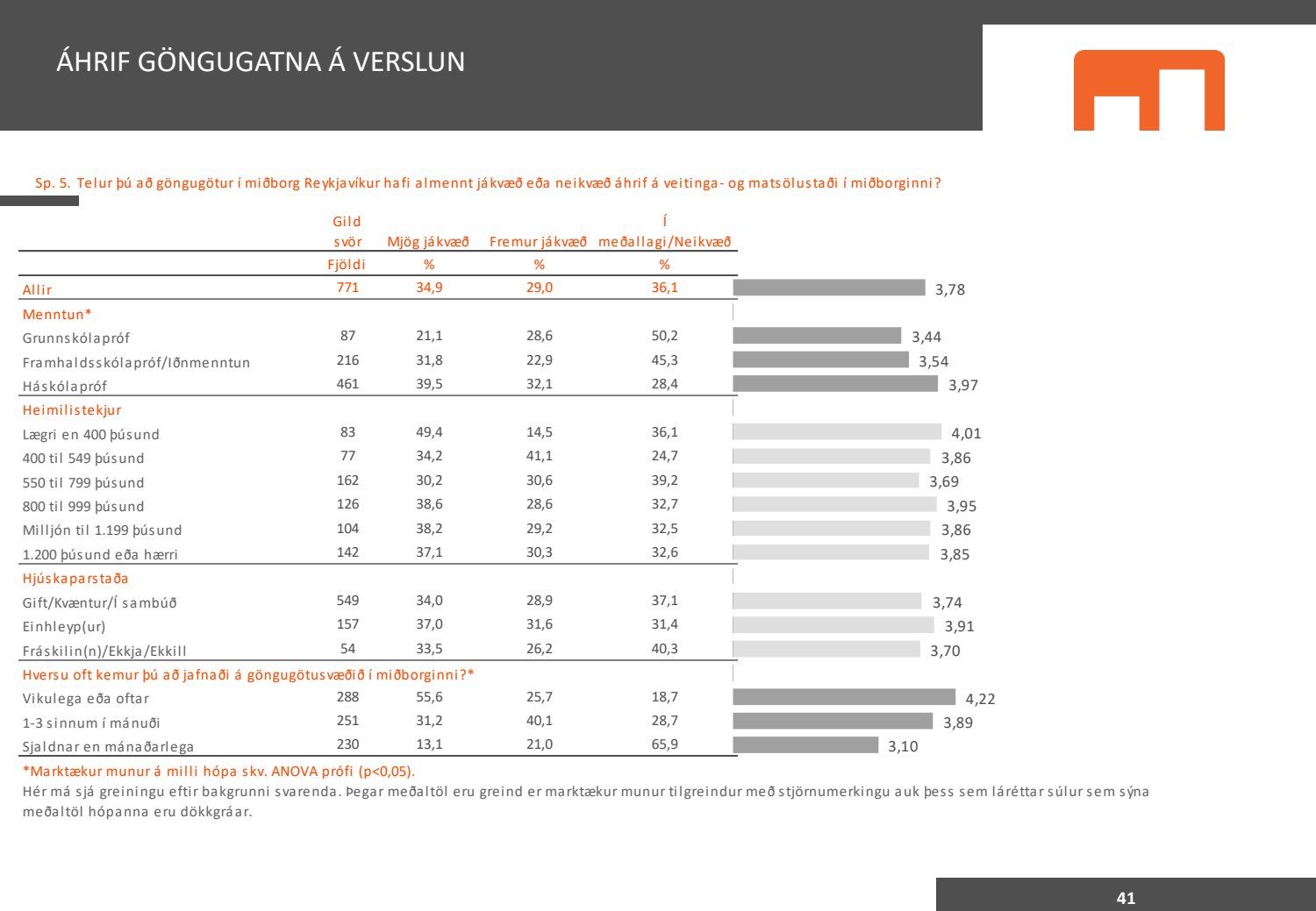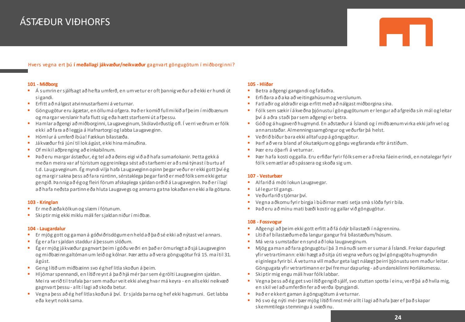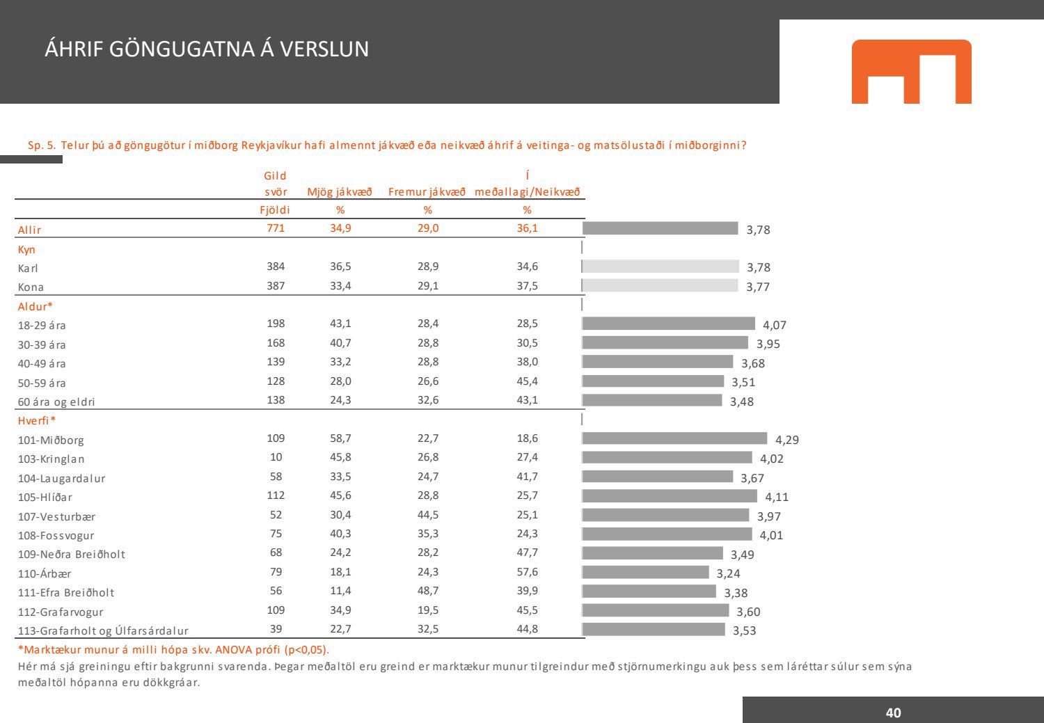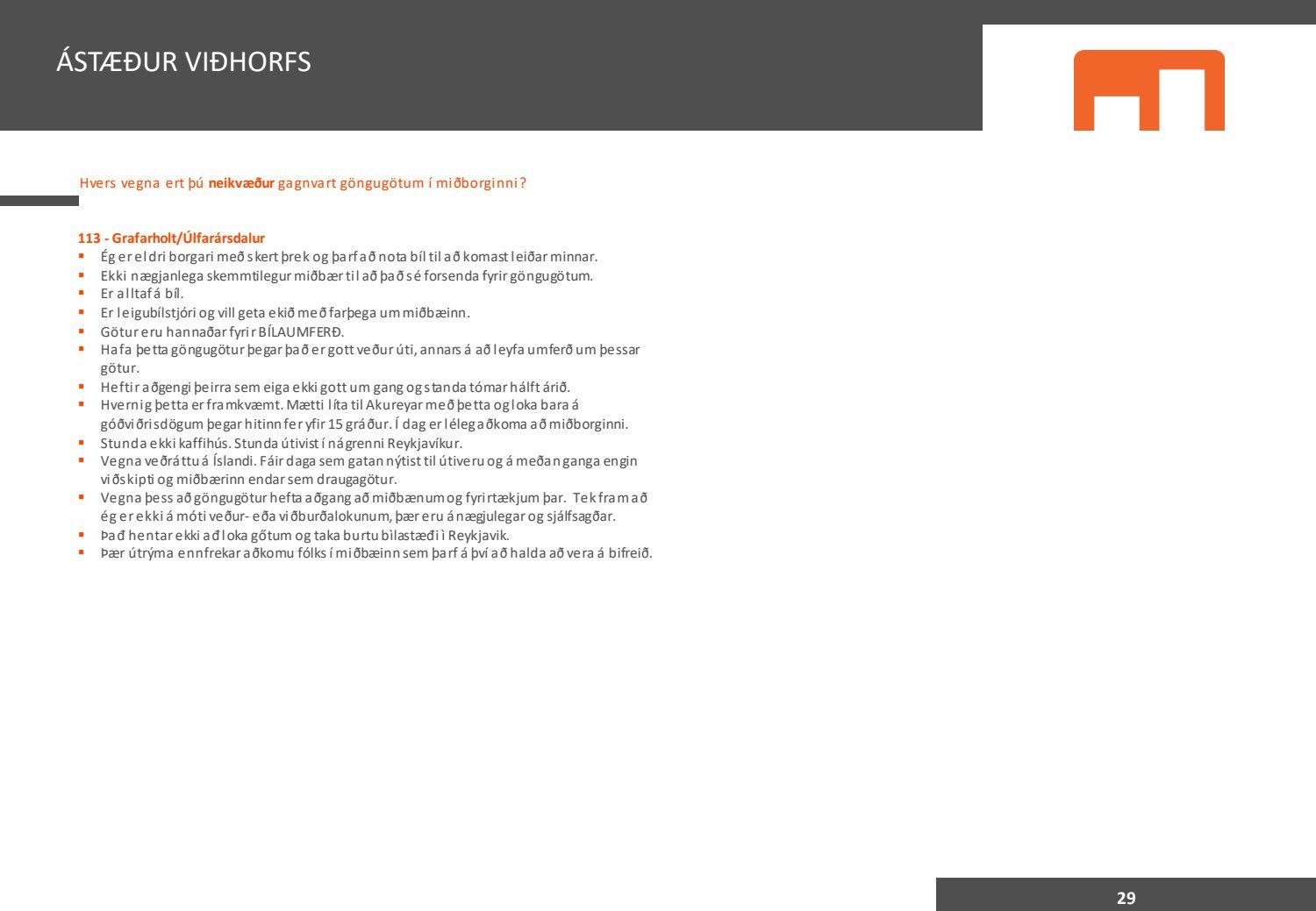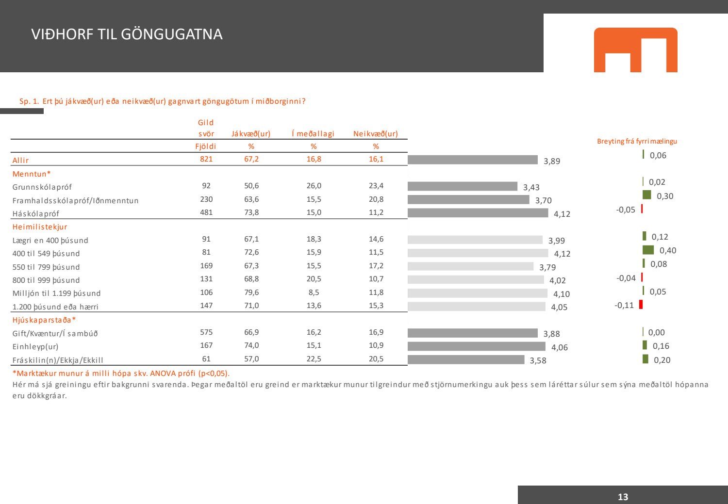 Viðhorfið sem birtist í könnuninni endurspeglar greinilega ekki viðhorf fólks sem er miður því maður vill gjarnan geta stuðst við kannanir að einhverju leyti. Kynningin gefur þá mynd að allir séu í raun húrrandi glaðir yfir ástandinu í bænum. Ef fulltrúi Flokks fólksins væri spurður hvað honum þætti almennt um göngugötur væri svarið að þær væru frábærar þar sem þær ættu við og þjónuðu sínum tilgangi. Ef horft er til göngugatna í miðbænum sem leiddu til lokunar umferðar hafa margir stigið fram og lýst óánægju sinni. Ekki síst hagaðilar sem hættu að fá til sín kúnna í sama mæli og áður. Fólk sem kom á svæðið er hætt að koma. Það vita það allir sem vilja hvernig komið er fyrir Laugavegi. Nú nýlega steig eigandi Máls og menningar fram og sagði að reksturinn hefði verið orðinn erfiður fyrir COVID. Sölutölurnar ljúga ekki og fylgja sölutölurnar lokunum gatna. Fólk sem ekki býr í nágrenninu kemur eðlilega minna þegar engar verslanir eru lengur á staðnum og aðgengi erfitt. Fulltrúi Flokks fólksins verður bara að vera heiðarlegur í þessu sambandi og segja að þessi könnun, niðurstöður hennar eru í ljósi alls þessa ekki trúverðugar eða í það minnsta gefur kynningin ranga mynd.