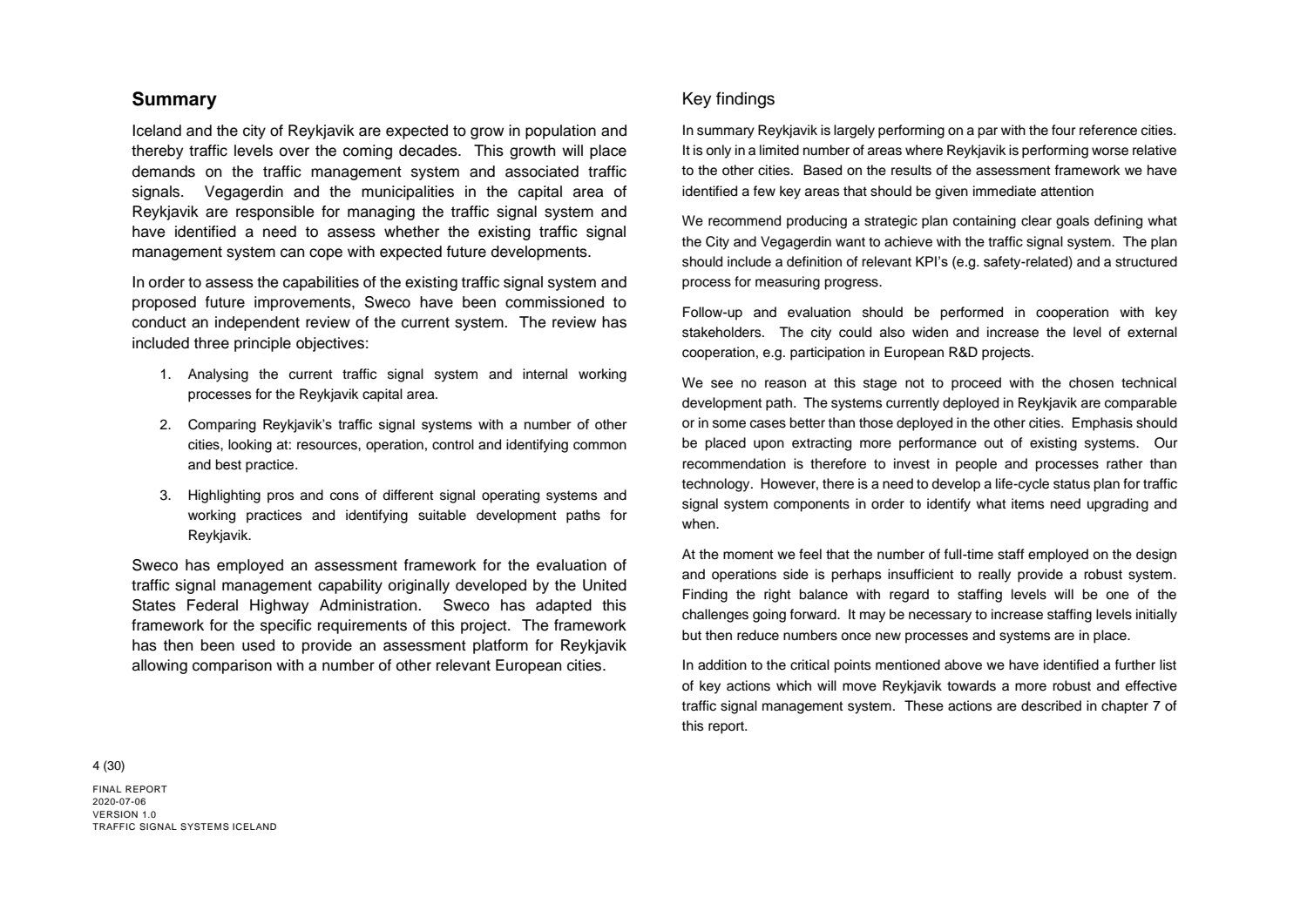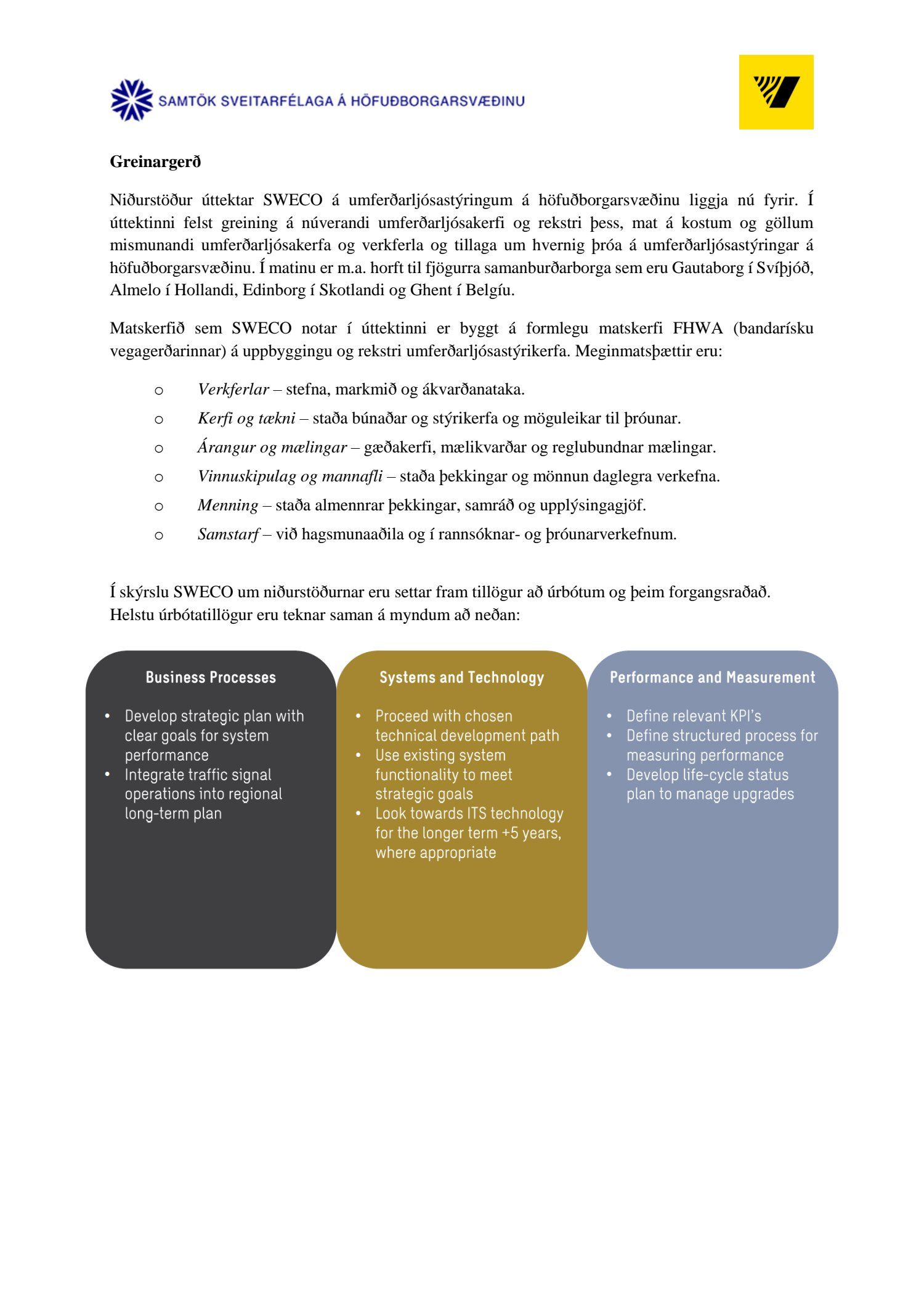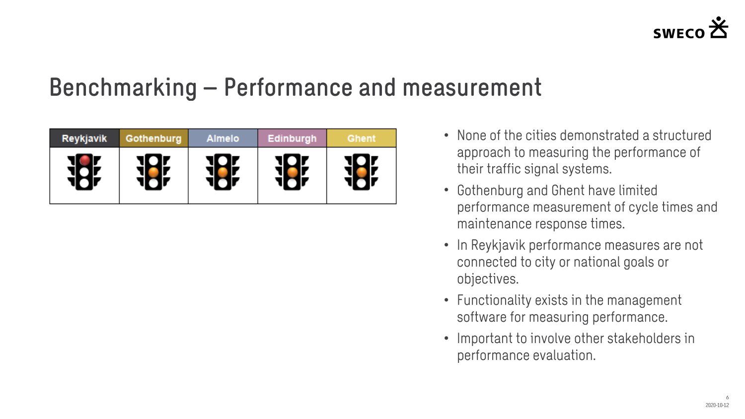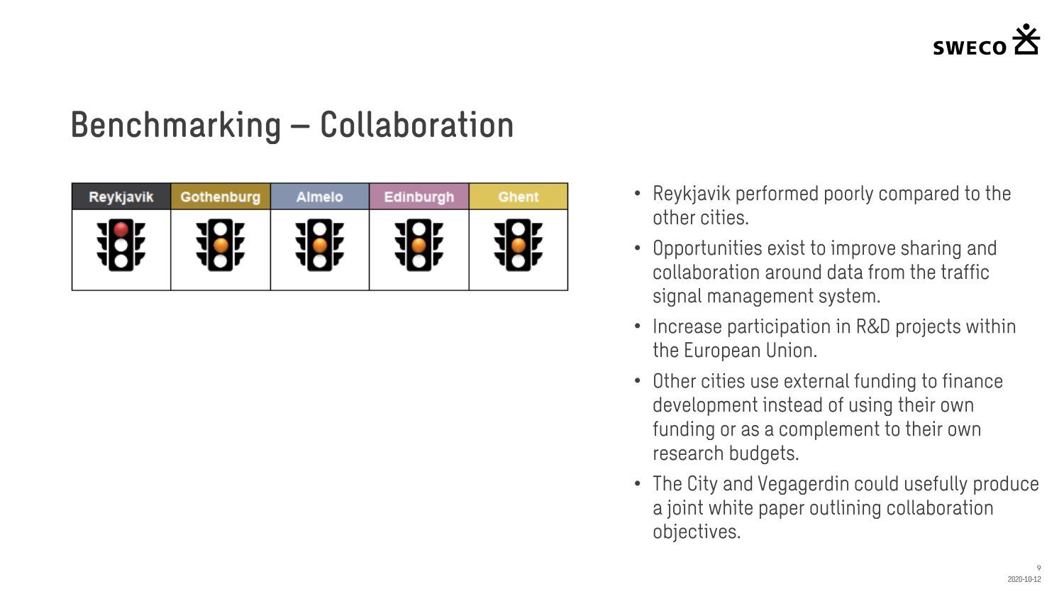 Niðurstaða greiningar Sweco er að fjárfesta þurfi meira í fólki og ferlum, frekar en búnaði. Búnaðurinn stendur framarlega samanborið við aðrar borgir en koma þyrfti á mælanlegum mælikvörðum t.d. varðandi öryggi og biðtíma gangandi og hjólandi, nýta betur sóknarfæri núverandi búnaðar og auka samráð milli ólíkra aðila í ferlinu. Með stofnun formlegs samráðsvettvangs fagaðila er lagður grundvöllur að innleiðingu þessara ráðlegginga úr skýrslu Sweco.