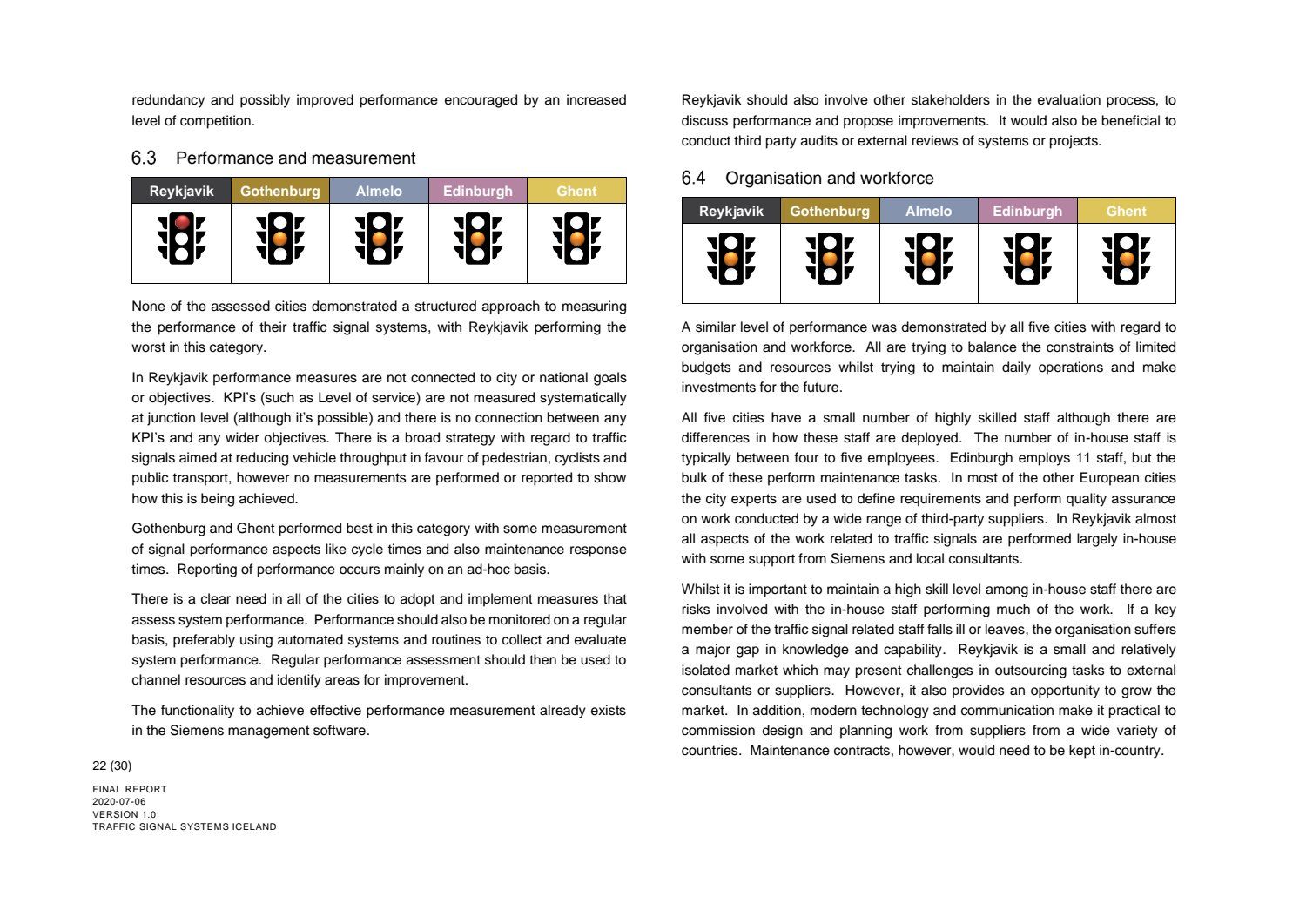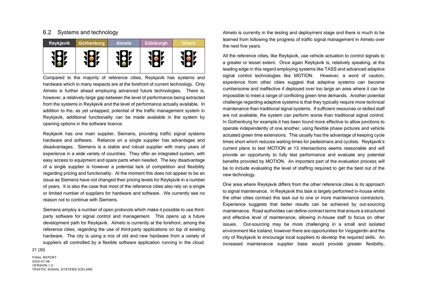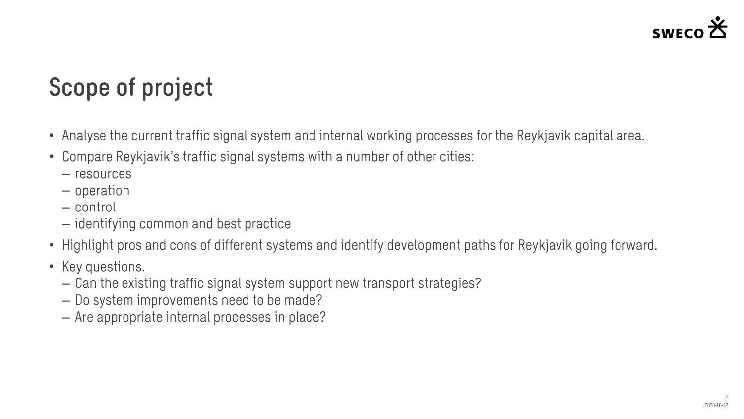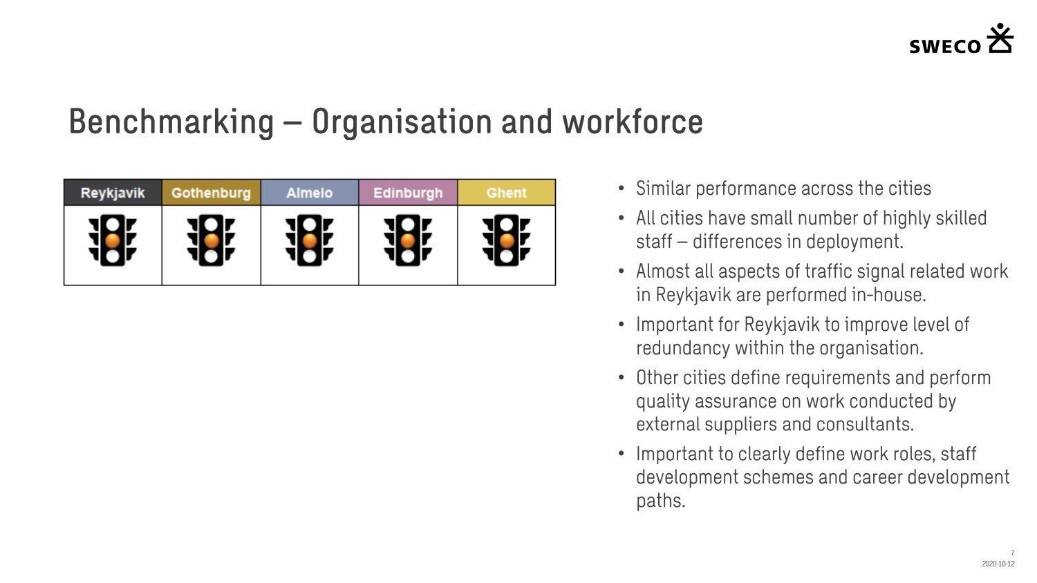 Niðurstaða greiningar Sweco er að fjárfesta þurfi meira í fólki og ferlum, frekar en búnaði. Búnaðurinn stendur framarlega samanborið við aðrar borgir en koma þyrfti á mælanlegum mælikvörðum t.d. varðandi öryggi og biðtíma gangandi og hjólandi, nýta betur sóknarfæri núverandi búnaðar og auka samráð milli ólíkra aðila í ferlinu. Með stofnun formlegs samráðsvettvangs fagaðila er lagður grundvöllur að innleiðingu þessara ráðlegginga úr skýrslu Sweco.