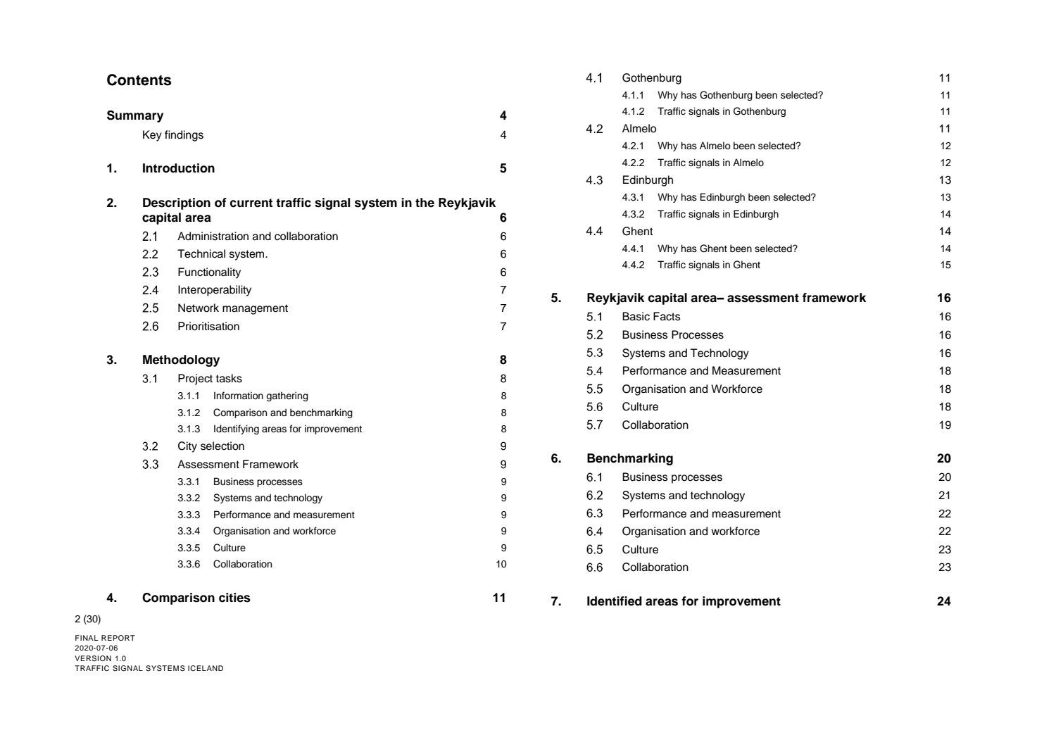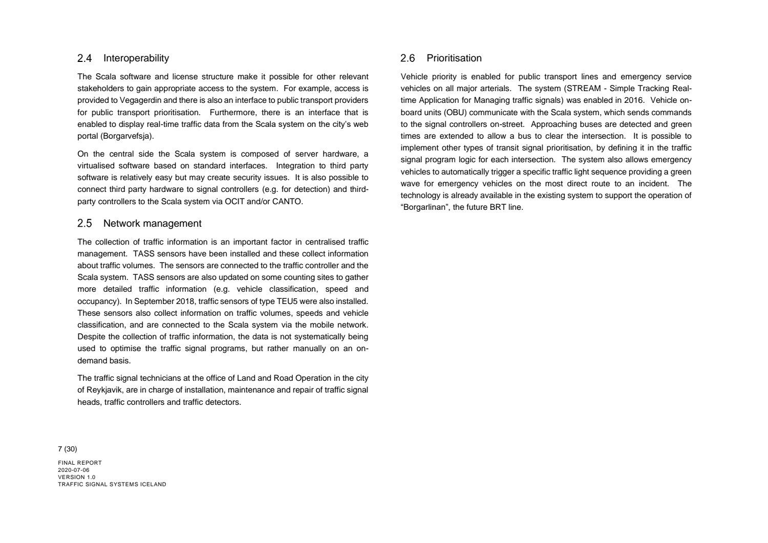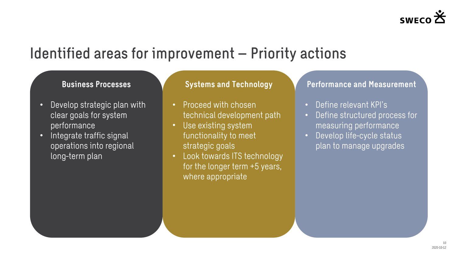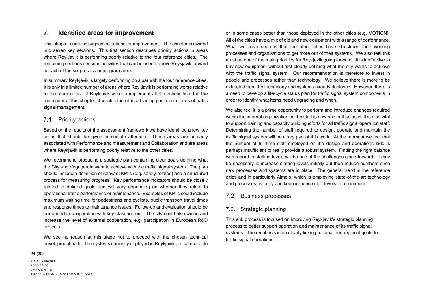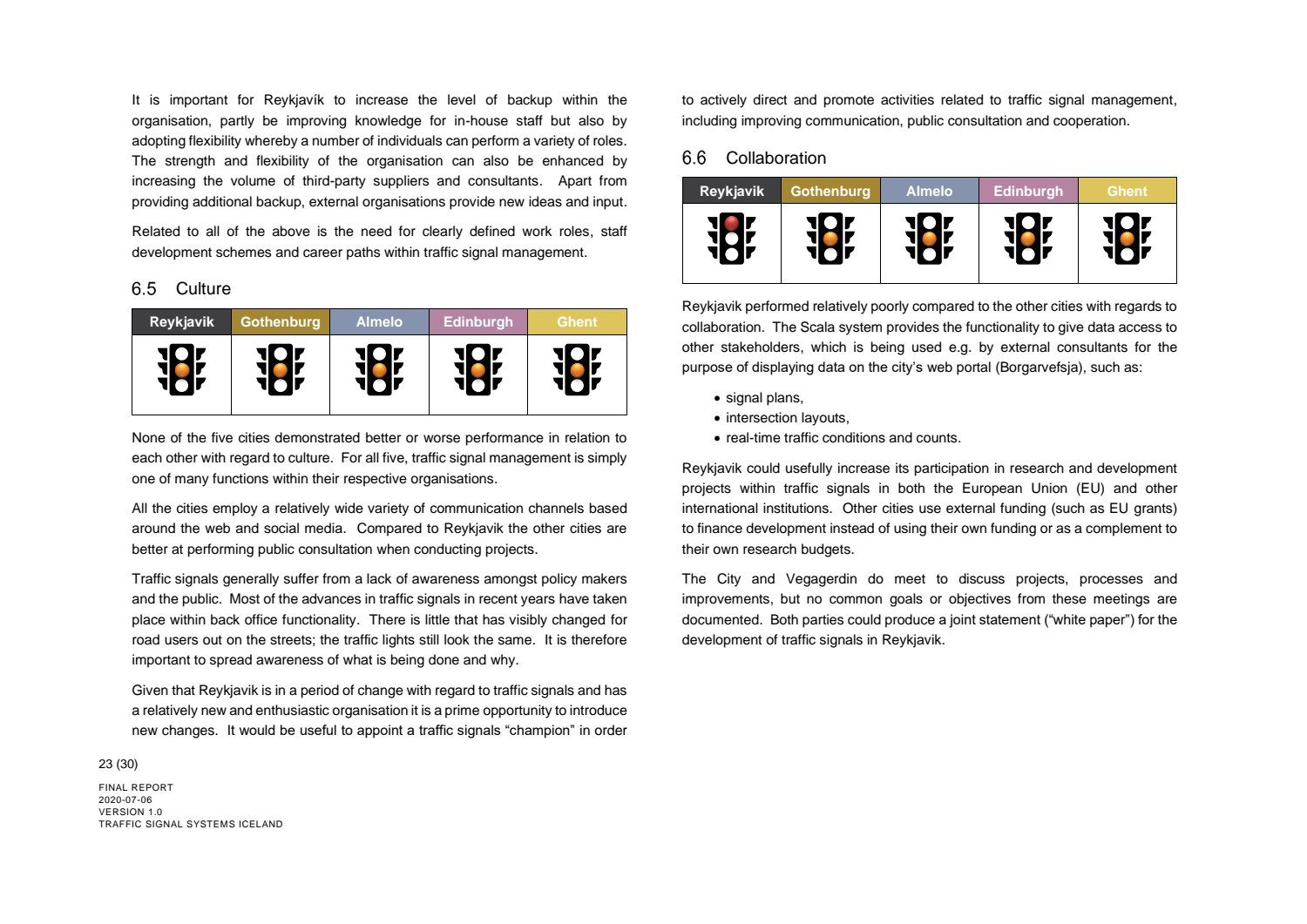 Niðurstaða greiningar Sweco er að fjárfesta þurfi meira í fólki og ferlum, frekar en búnaði. Búnaðurinn stendur framarlega samanborið við aðrar borgir en koma þyrfti á mælanlegum mælikvörðum t.d. varðandi öryggi og biðtíma gangandi og hjólandi, nýta betur sóknarfæri núverandi búnaðar og auka samráð milli ólíkra aðila í ferlinu. Með stofnun formlegs samráðsvettvangs fagaðila er lagður grundvöllur að innleiðingu þessara ráðlegginga úr skýrslu Sweco.