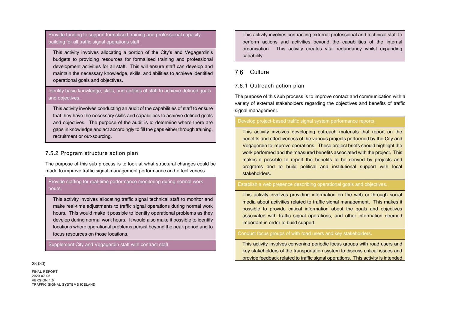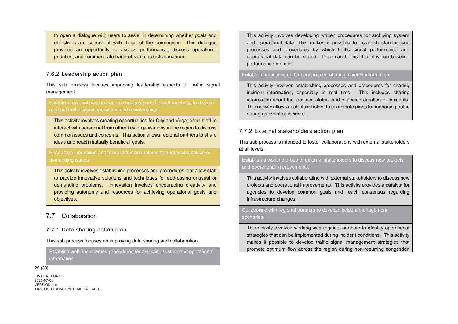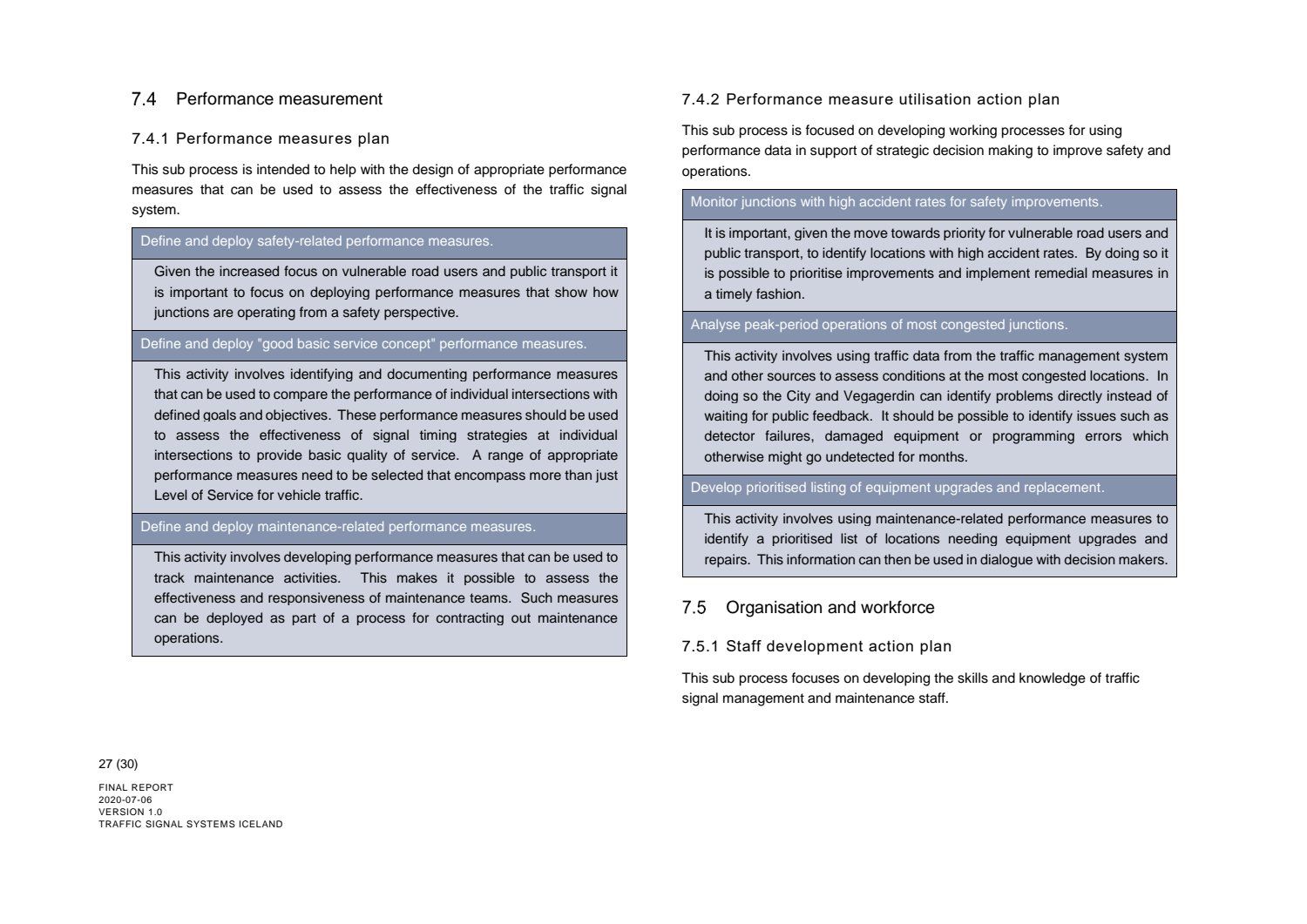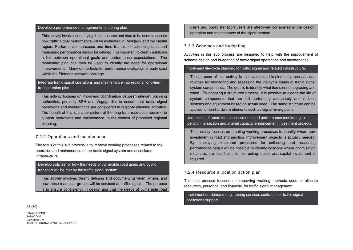 Niðurstaða greiningar Sweco er að fjárfesta þurfi meira í fólki og ferlum, frekar en búnaði. Búnaðurinn stendur framarlega samanborið við aðrar borgir en koma þyrfti á mælanlegum mælikvörðum t.d. varðandi öryggi og biðtíma gangandi og hjólandi, nýta betur sóknarfæri núverandi búnaðar og auka samráð milli ólíkra aðila í ferlinu. Með stofnun formlegs samráðsvettvangs fagaðila er lagður grundvöllur að innleiðingu þessara ráðlegginga úr skýrslu Sweco.