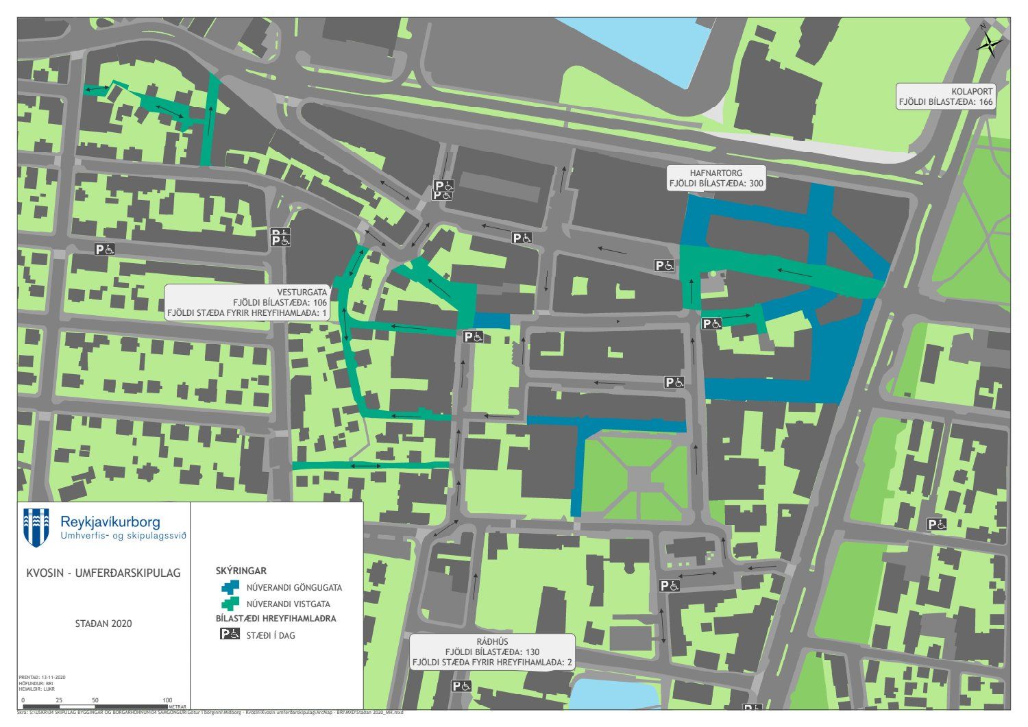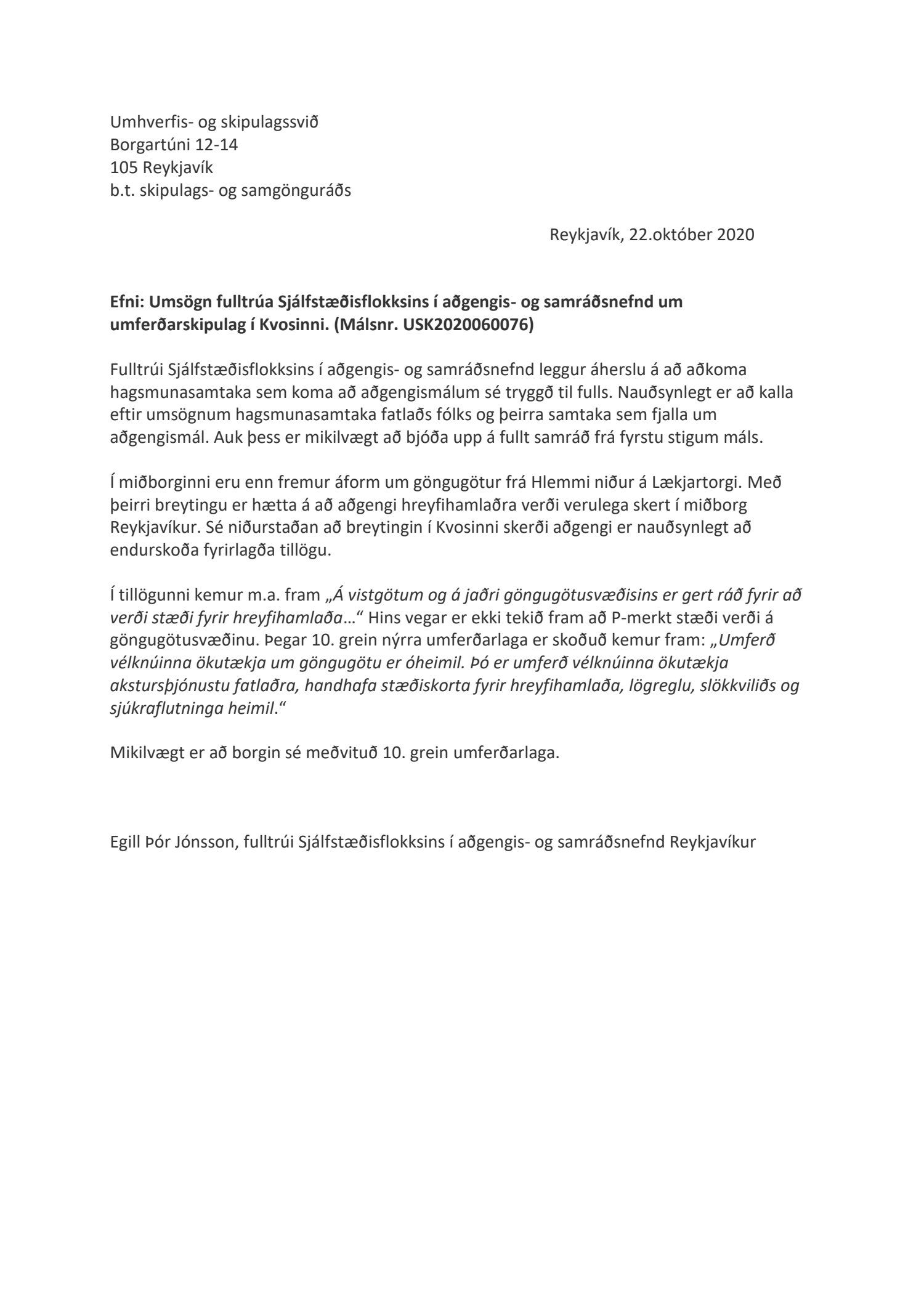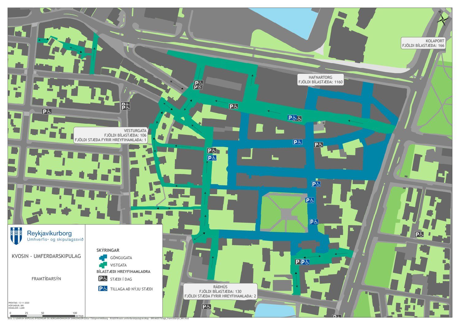 Um er að ræða Kvosina sem einkennist af þrengslum. Fulltrúi Flokks fólksins minnir á rétt allra til að hafa aðgengi. Þá er átt við þá sem ýmist koma akandi, gangandi, hjólandi, í almenningssamgöngum og fatlað fólk og þeir sem losa vörur. Stór hluti svæðisins er nú þegar göngugötur eða vistgötur. Fyrst á að gera vistgötur og svo göngugötur? Stæðum mun fækka verulega. Væri ekki nær að leyfa vistgötum að vera áfram vistgötur og veður þá vissulega að merkja stæði íbúum og gestastæði auk stæða fyrir P merkta bíla? Best væri ef vistgötur væru fleiri og göngugötur færri þar sem gildandi umferðarlög setja veghaldara þröngar skorður um hvaða umferð er heimil á göngugötum. Með vistgötum helst þó aðgengi íbúa óbreytt frá því sem er í dag svo fremi sem stæði séu merkt þeim. Ekki liggur fyrir með hvaða hætti hægt er að tryggja íbúum innan göngugötusvæða áfram aðgengi að eignum sínum noti þeir bíl. Óttast er að þessi óvissa fæli fólk frá að vilja fjárfesta á þessu svæði og rekstraraðila að opna verslanir þar. Stæðum fyrir hreyfihamlaða á að fjölga sem er gott. Skipulagsyfirvöld sendu minnisblað til Alþingis og vildu ráða hvaða göngugötur P merktir bílar megi aka um. Svar hefur ekki borist og mun sennilega ekki gera.
