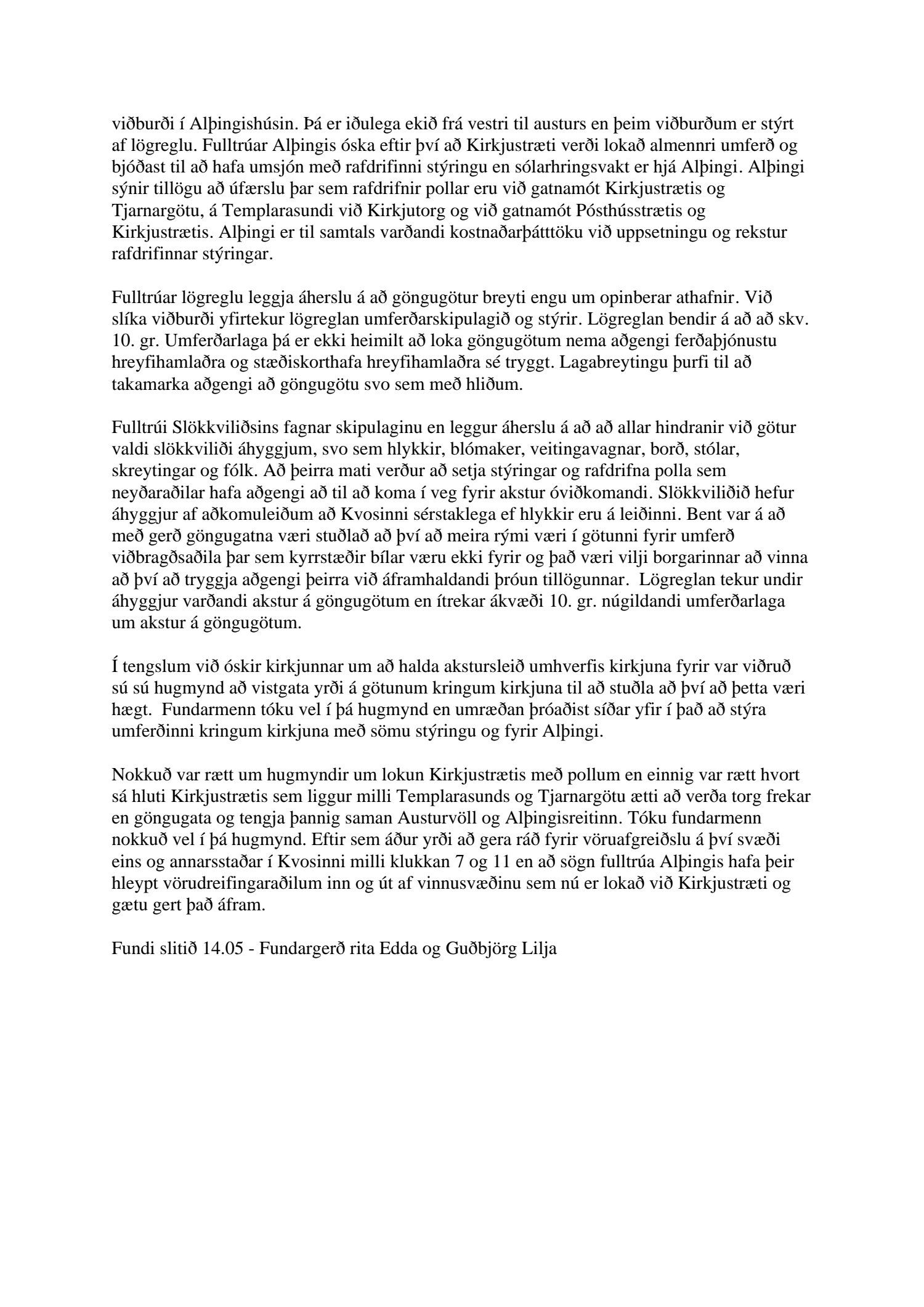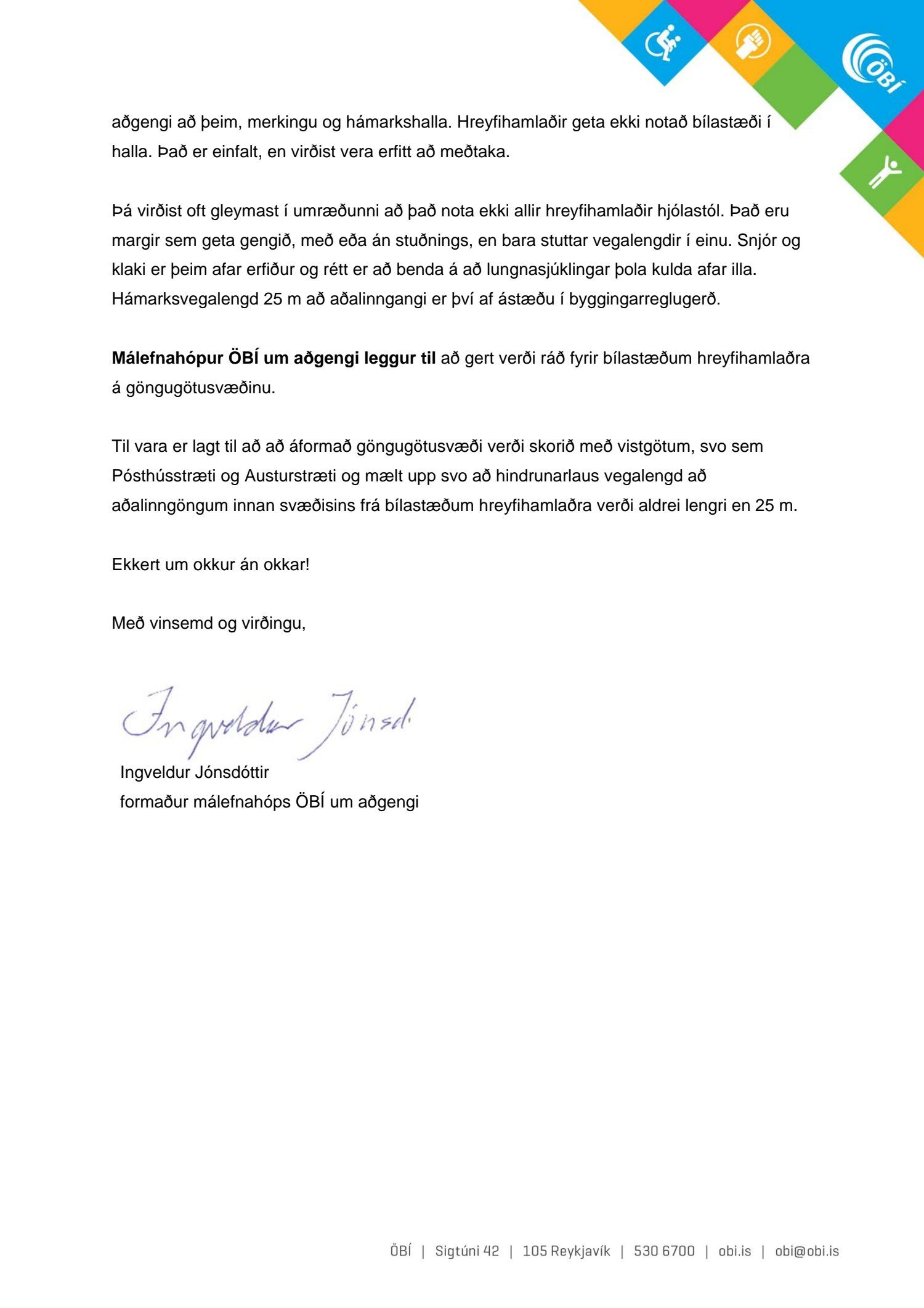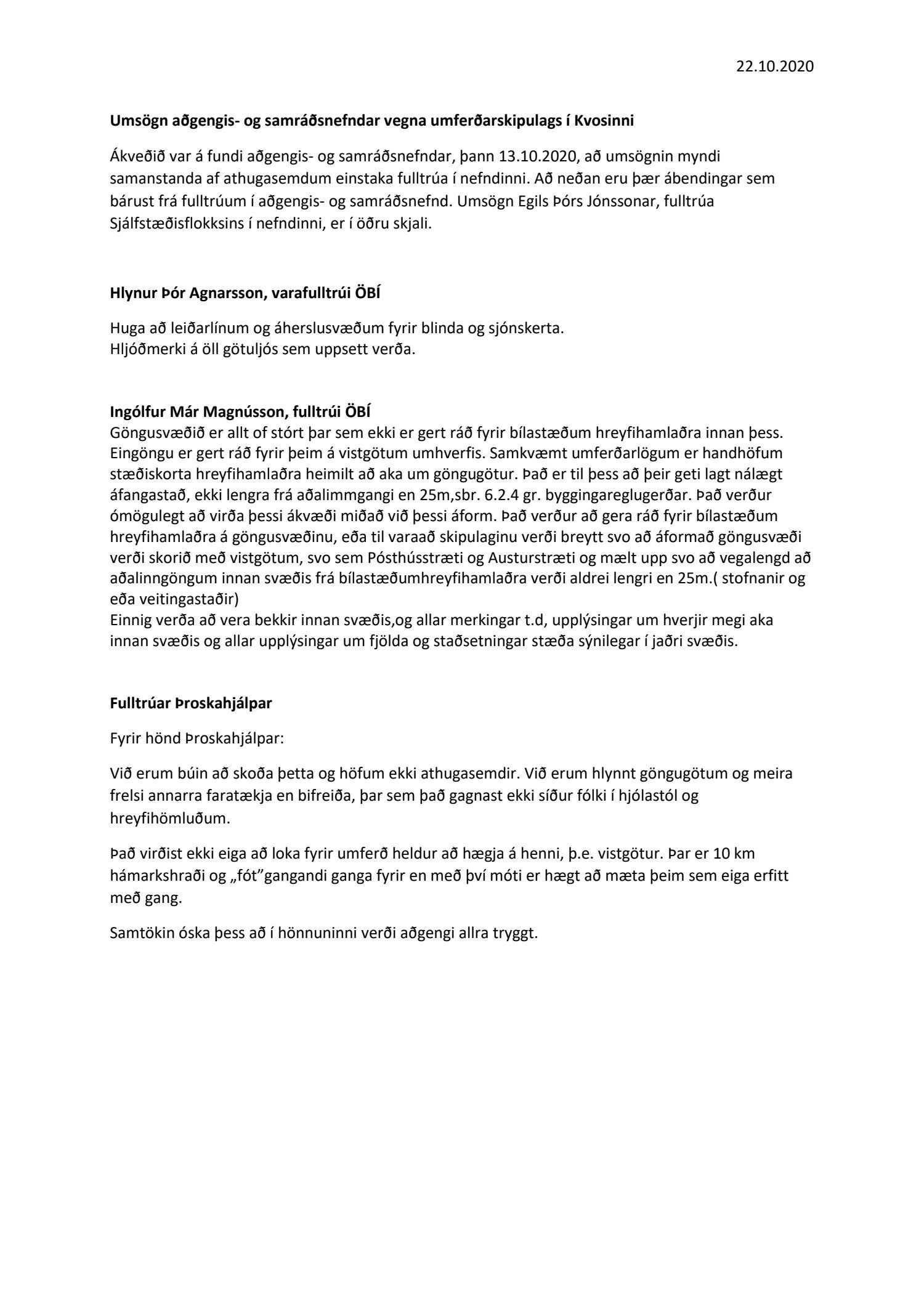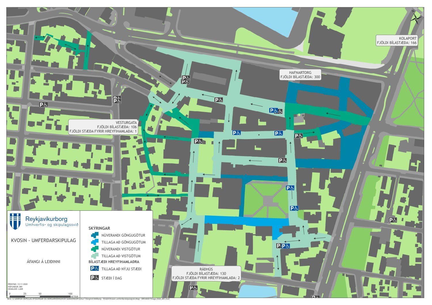 Um er að ræða Kvosina sem einkennist af þrengslum. Fulltrúi Flokks fólksins minnir á rétt allra til að hafa aðgengi. Þá er átt við þá sem ýmist koma akandi, gangandi, hjólandi, í almenningssamgöngum og fatlað fólk og þeir sem losa vörur. Stór hluti svæðisins er nú þegar göngugötur eða vistgötur. Fyrst á að gera vistgötur og svo göngugötur? Stæðum mun fækka verulega. Væri ekki nær að leyfa vistgötum að vera áfram vistgötur og veður þá vissulega að merkja stæði íbúum og gestastæði auk stæða fyrir P merkta bíla? Best væri ef vistgötur væru fleiri og göngugötur færri þar sem gildandi umferðarlög setja veghaldara þröngar skorður um hvaða umferð er heimil á göngugötum. Með vistgötum helst þó aðgengi íbúa óbreytt frá því sem er í dag svo fremi sem stæði séu merkt þeim. Ekki liggur fyrir með hvaða hætti hægt er að tryggja íbúum innan göngugötusvæða áfram aðgengi að eignum sínum noti þeir bíl. Óttast er að þessi óvissa fæli fólk frá að vilja fjárfesta á þessu svæði og rekstraraðila að opna verslanir þar. Stæðum fyrir hreyfihamlaða á að fjölga sem er gott. Skipulagsyfirvöld sendu minnisblað til Alþingis og vildu ráða hvaða göngugötur P merktir bílar megi aka um. Svar hefur ekki borist og mun sennilega ekki gera.