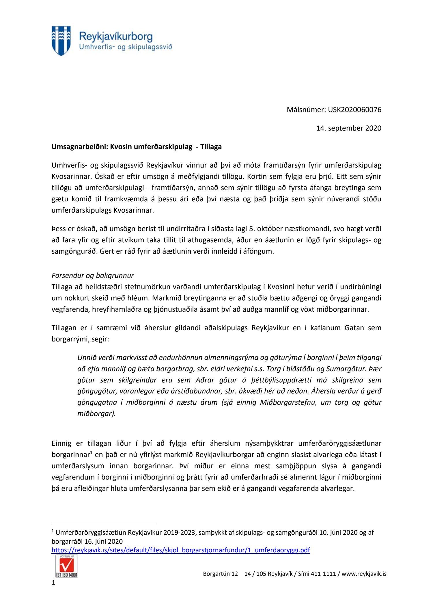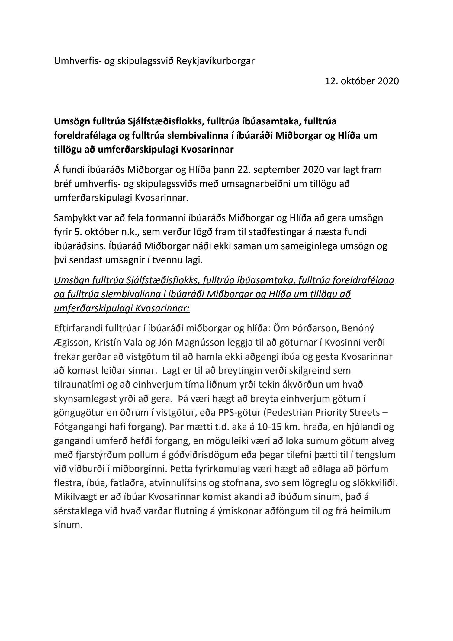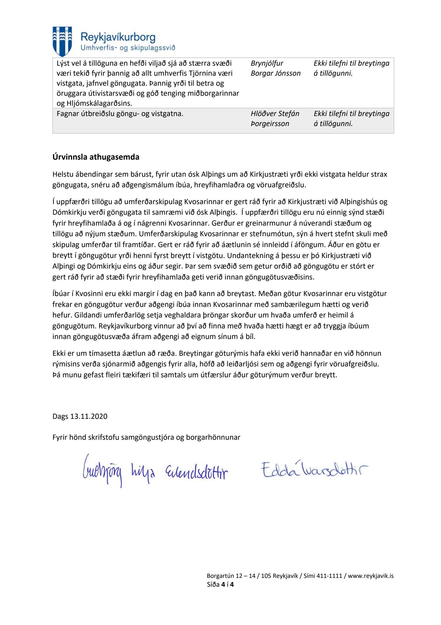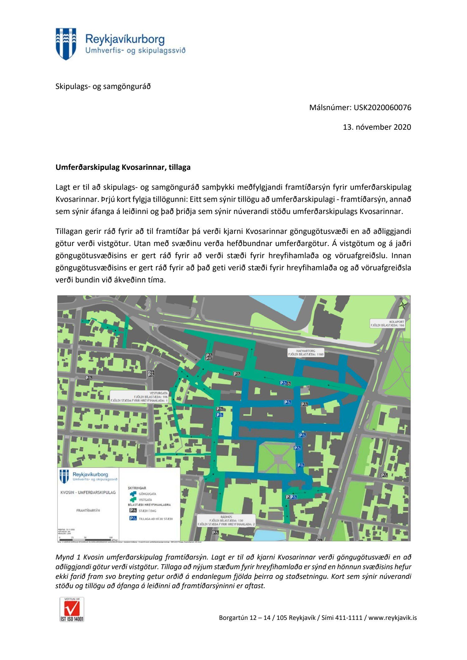 Hér er verið að stækka göngugötusvæðið í Kvosinni í samræmi við ákvörðun borgarstjórnar frá september 2018. Nálægar götur eru gerðar að vistgötum. Umhverfið verðu mannvænna og við fögnum því. Jafnframt telur meirihluti skipulags- og samgönguráðs að rétt sé að fara fram á það við löggjafann að umferðarlög verði skýrð á þann hátt að sveitarfélög fái aukin sveigjanleika varðandi akstur íbúa og að heimildir P-korta-hafa geti tekið mið af svæðisbundnum aðstæðum hverju sinni.