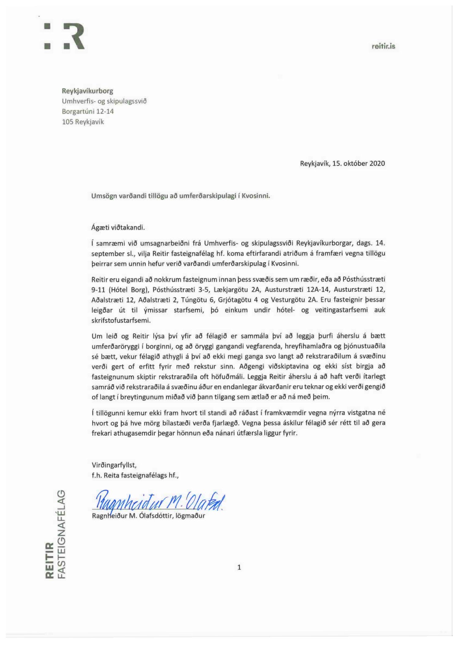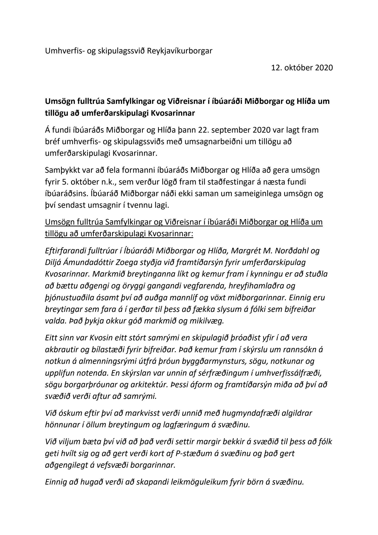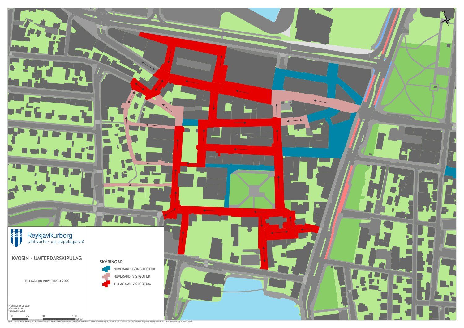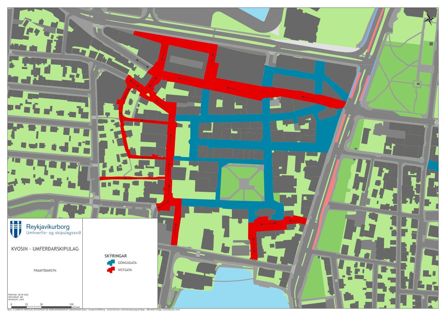 Hér er verið að stækka göngugötusvæðið í Kvosinni í samræmi við ákvörðun borgarstjórnar frá september 2018. Nálægar götur eru gerðar að vistgötum. Umhverfið verðu mannvænna og við fögnum því. Jafnframt telur meirihluti skipulags- og samgönguráðs að rétt sé að fara fram á það við löggjafann að umferðarlög verði skýrð á þann hátt að sveitarfélög fái aukin sveigjanleika varðandi akstur íbúa og að heimildir P-korta-hafa geti tekið mið af svæðisbundnum aðstæðum hverju sinni.