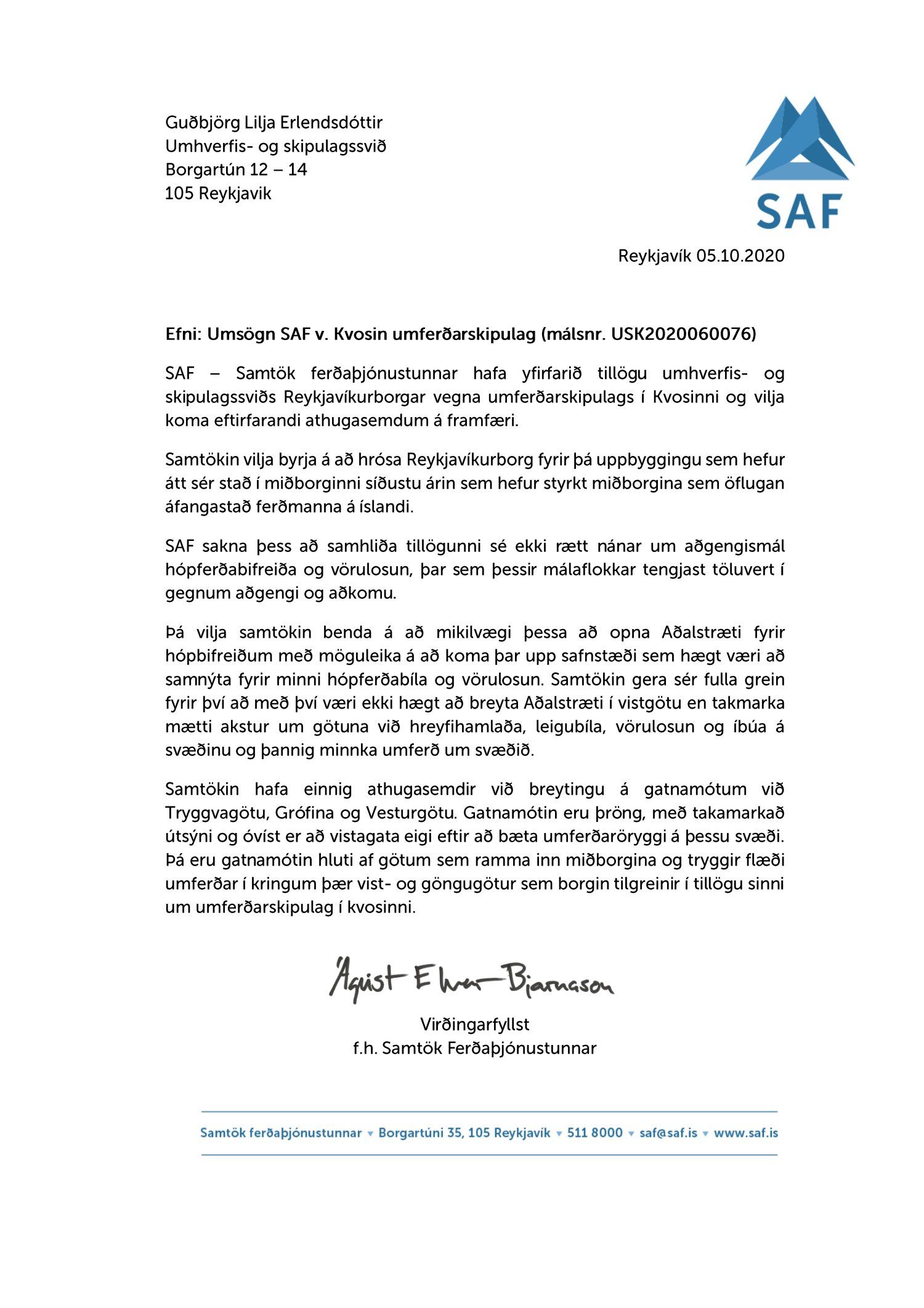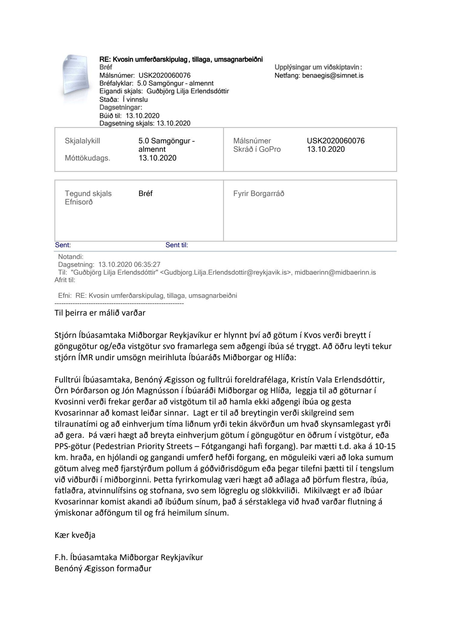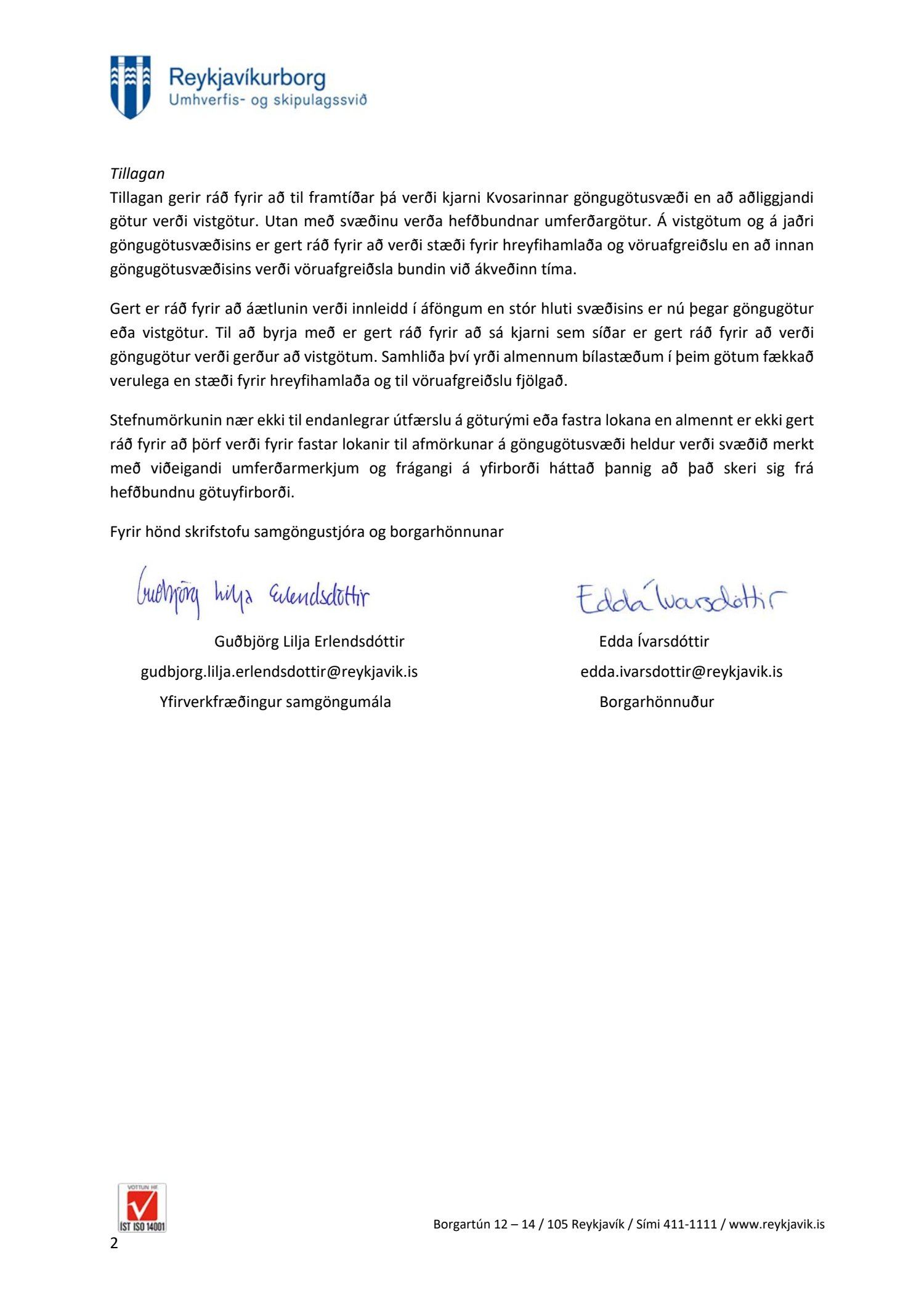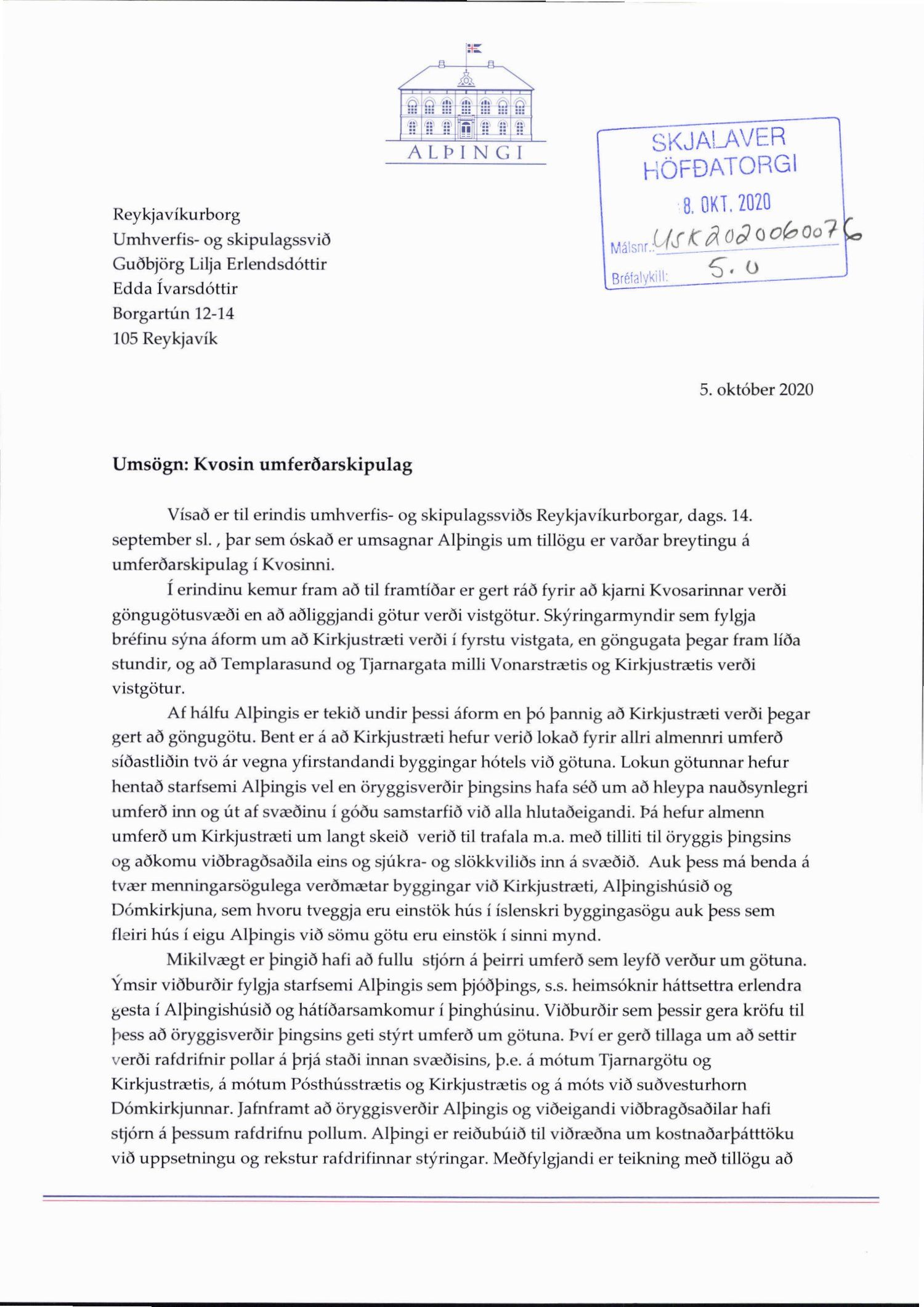 Hér er verið að stækka göngugötusvæðið í Kvosinni í samræmi við ákvörðun borgarstjórnar frá september 2018. Nálægar götur eru gerðar að vistgötum. Umhverfið verðu mannvænna og við fögnum því. Jafnframt telur meirihluti skipulags- og samgönguráðs að rétt sé að fara fram á það við löggjafann að umferðarlög verði skýrð á þann hátt að sveitarfélög fái aukin sveigjanleika varðandi akstur íbúa og að heimildir P-korta-hafa geti tekið mið af svæðisbundnum aðstæðum hverju sinni.