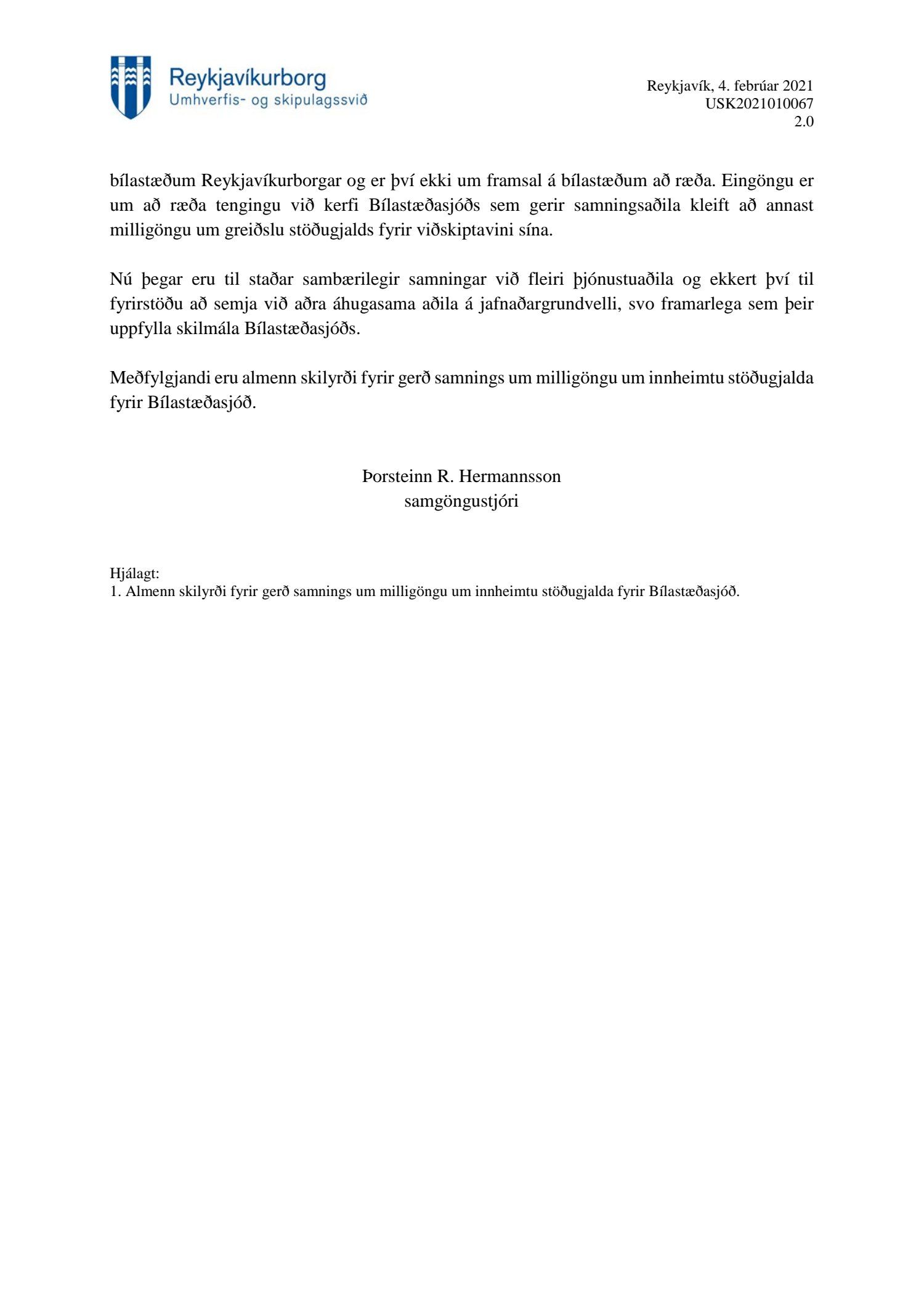 Hér er um hreina og klára verðhækkun að ræða við gjaldtöku þegar bílastæði Reykjavíkur eru notuð. Er nú nóg samt. Það er með ólíkindum að Reykjavíkurborg sem stjórnvald skuli útvista gæðum sínum til einkaaðila með það eitt að leiðarljósi að hækka gjöld á notendur. Verið er að búa til „millistykki“ á milli bílastæðasjóðs og notenda bílastæðanna. Til hvers í ósköpunum? Hér er um fundið fé fyrir þann aðila sem fékk dílinn. Mánaðaráskrift kostar 529 kr. á mánuði og stakt gjald er 95 kr. Málefni bílastæðissjóðs er rannsóknarefni og skemmst er að minnast þess að Landsspítalinn hefur nýlega fengið að taka upp gjaldtöku bílastæða á kostnað bílastæðissjóðs og hirðir ágóðann af bílastæðunum í eigin þágu. Sífellt er verið að seilast lengra og lengra í vasa notenda bílastæða hjá Reykjavíkurborg. Líklega á slíkt að hafa fælingarmátt á þá sem kjósa að nota fjölskyldubílinn eins og stefna meirihlutans er. Ágætt að allir átti sig á því.