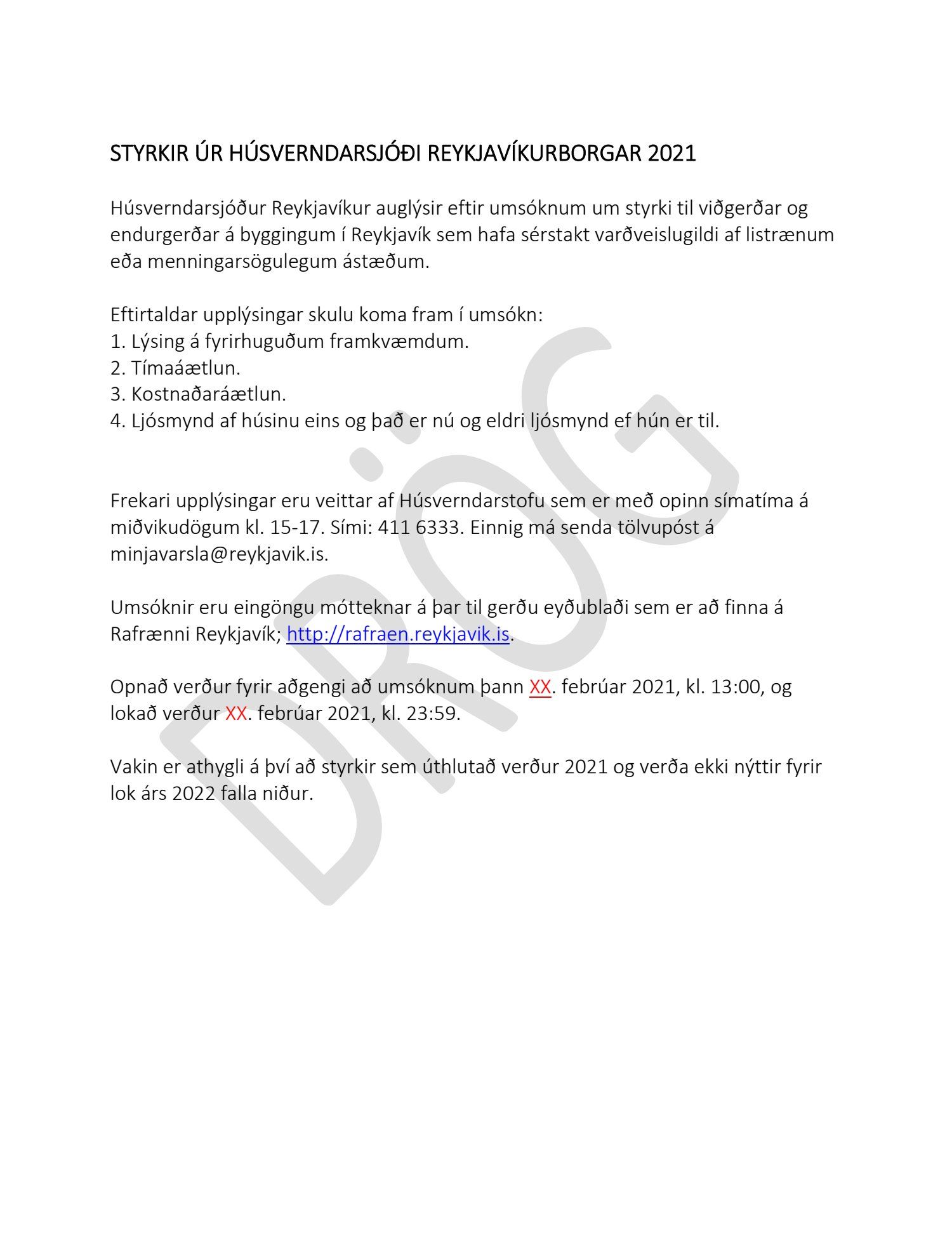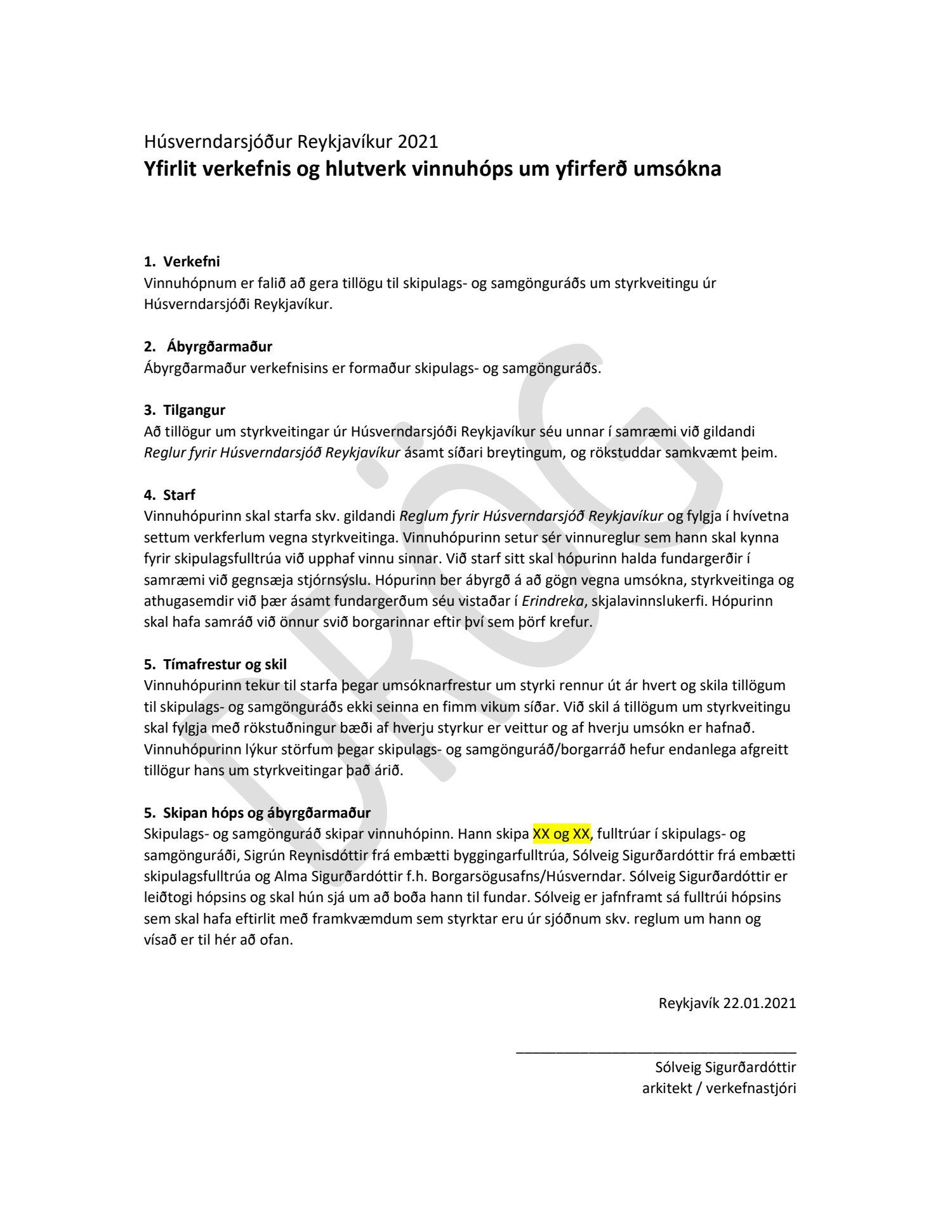 Lögð fram drög að yfirliti verkefnis og hlutverks vinnuhóps um yfirferð umsókna til Húsverndarsjóðs Reykjavíkur 2021. Þar kemur fram að Sigrún Reynisdóttir frá embætti byggingingarfulltrúa, Sólveig Sigurðardóttir frá embætti skipulagsfulltrúa og Alma Sigurðardóttir frá embætti borgarminjavarðar skipi vinnuhópinn auk tveggja fulltrúa skipulags- og samgönguráðs. Lagt er til að skipulags- og samgönguráð skipi tvo fulltrúa í hópinn.