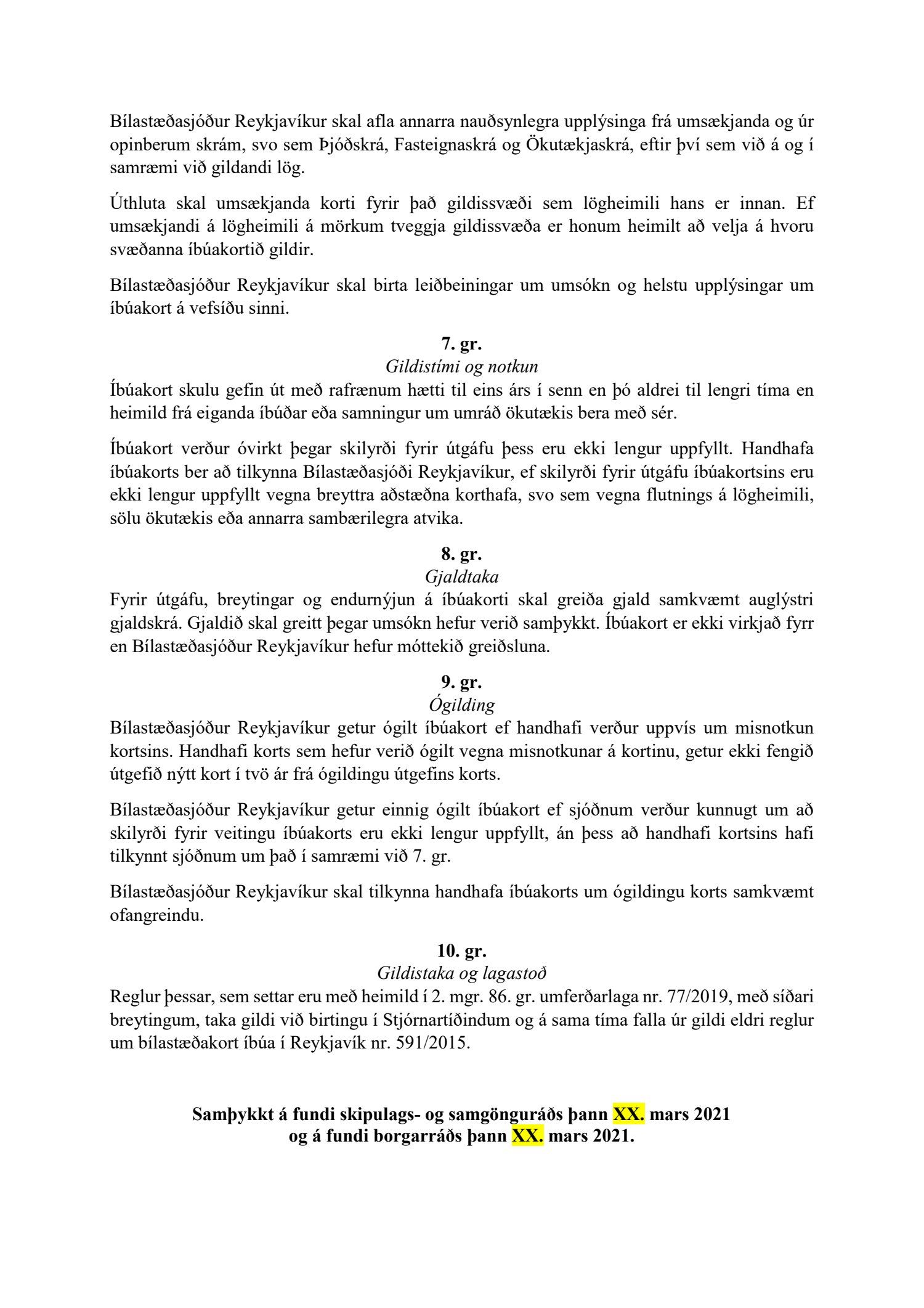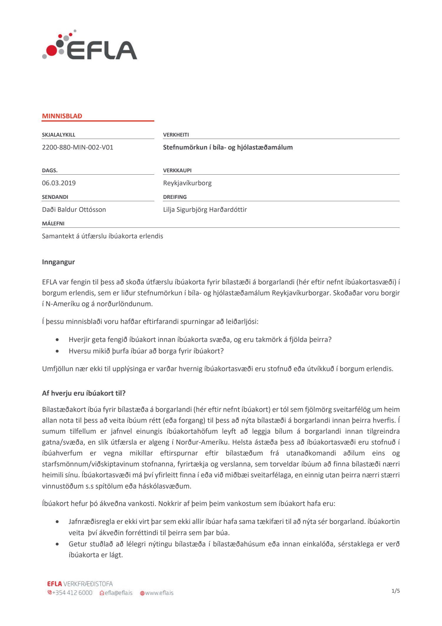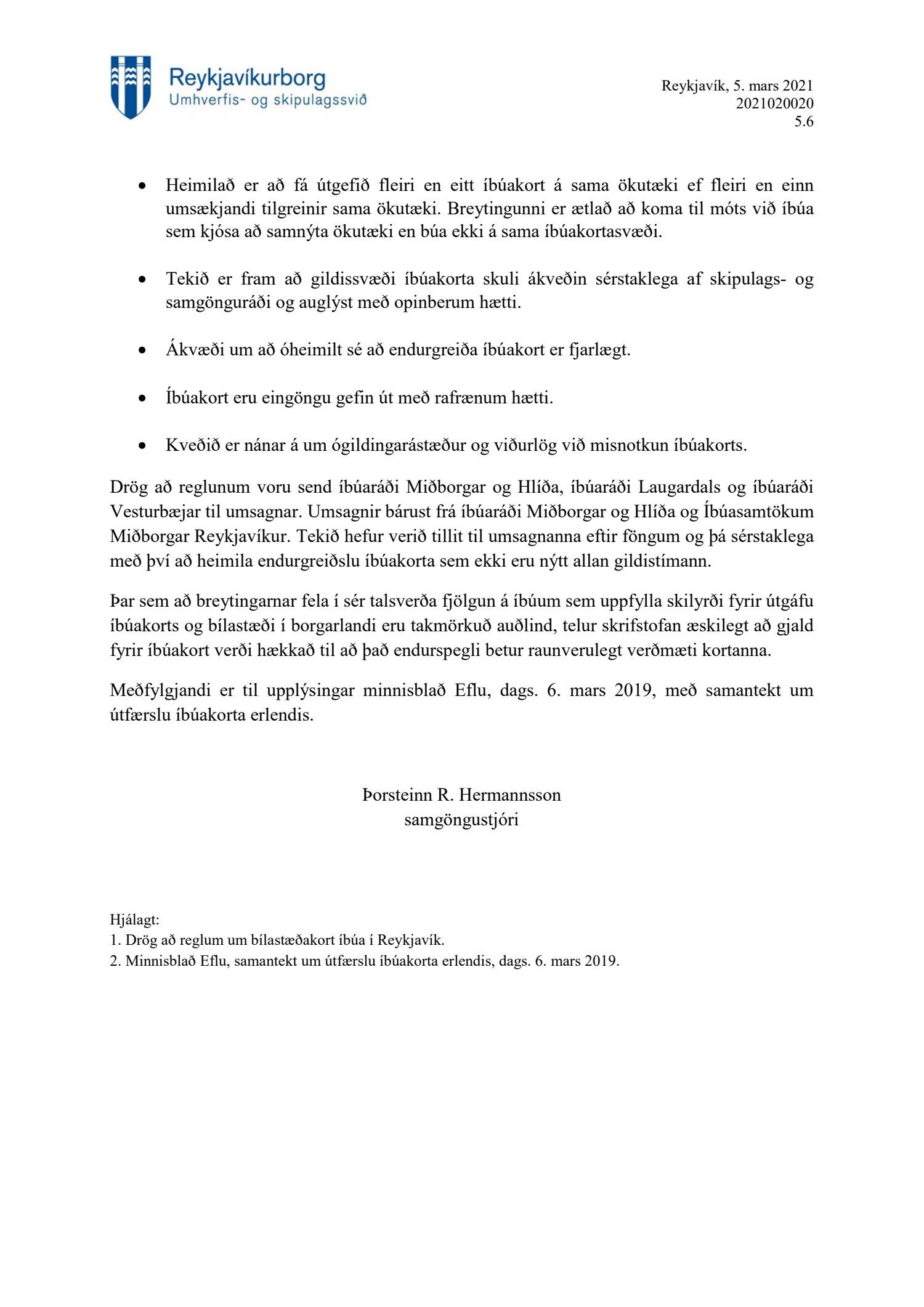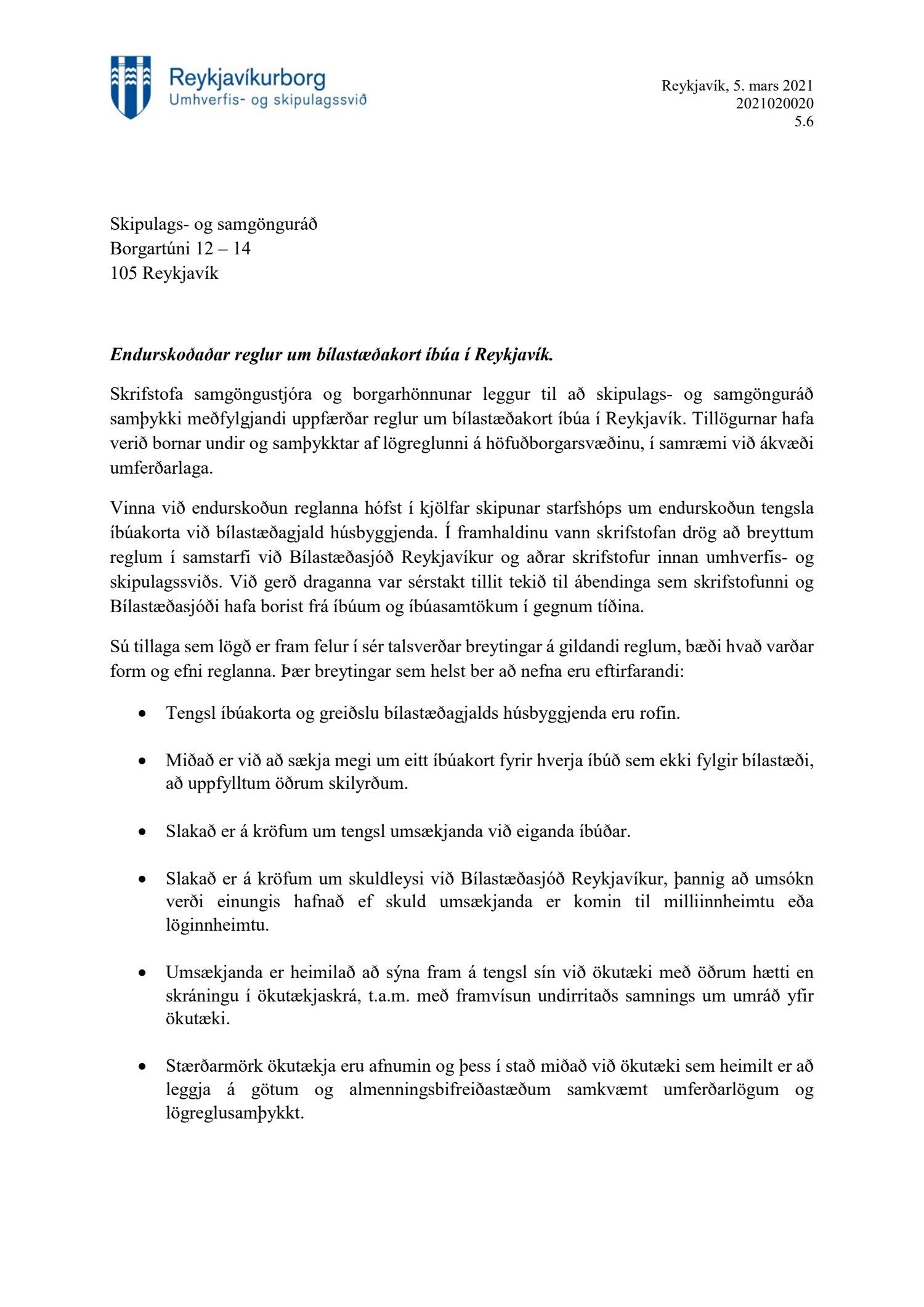 Lögð fram tillaga skrifstofu samgöngustjóra og borgarhönnunar, dags. 5. mars 2021, um uppfærðar reglur um bílastæðakort íbúa í Reykjavík. Einnig eru lögð fram drög að endurskoðuðum reglum um bílastæðakort íbúa í Reykjavík og minnisblað Eflu, samantekt um útfærslu íbúakorta erlendis, dags. 6. mars 2019.
