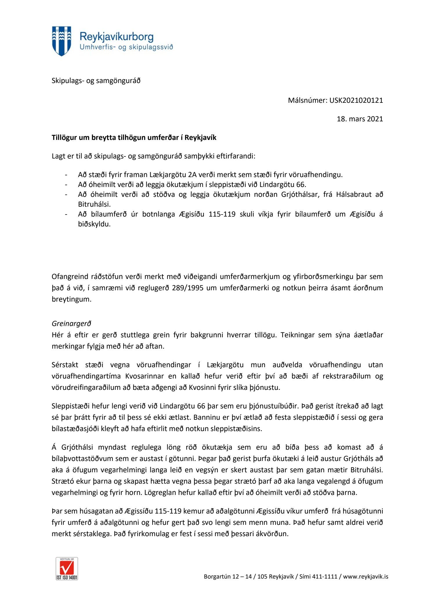 Lagt er til að skipulags- og samgönguráð samþykki eftirfarandi: - Að stæði fyrir framan Lækjargötu 2A verði merkt sem stæði fyrir vöruafhendingu. - Að óheimilt verði að leggja ökutækjum í sleppistæði við Lindargötu 66. - Að óheimilt verði að stöðva og leggja ökutækjum norðan Grjóthálsar, frá Hálsabraut að Bitruhálsi. - Að bílaumferð úr botnlanga Ægisíðu 115-119 skuli víkja fyrir bílaumferð um Ægisíðu á biðskyldu. Ofangreind ráðstöfun verði merkt með viðeigandi umferðarmerkjum og yfirborðsmerkingu þar sem það á við, í samræmi við reglugerð 289/1995 um umferðarmerki og notkun þeirra ásamt áorðnum breytingum.