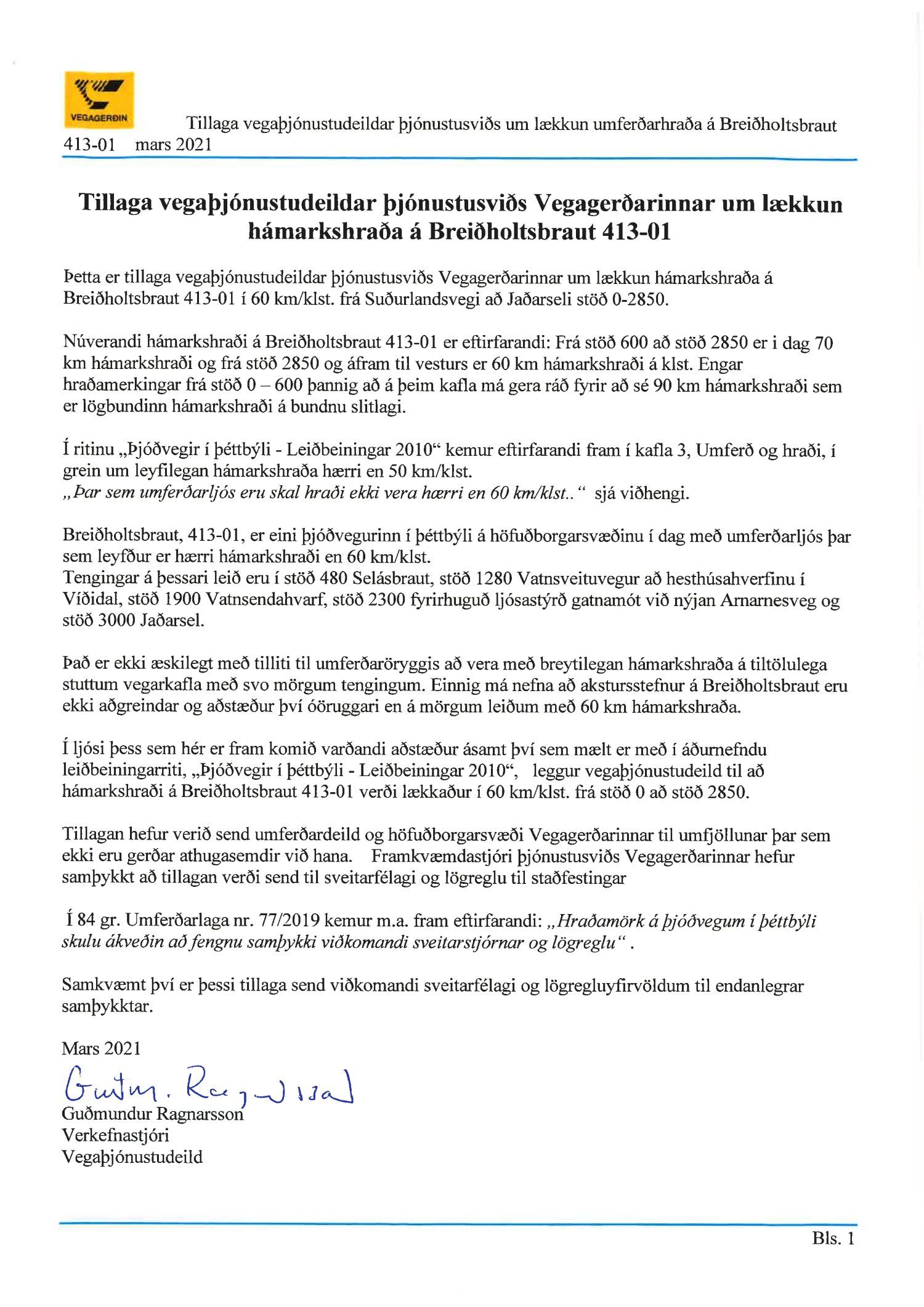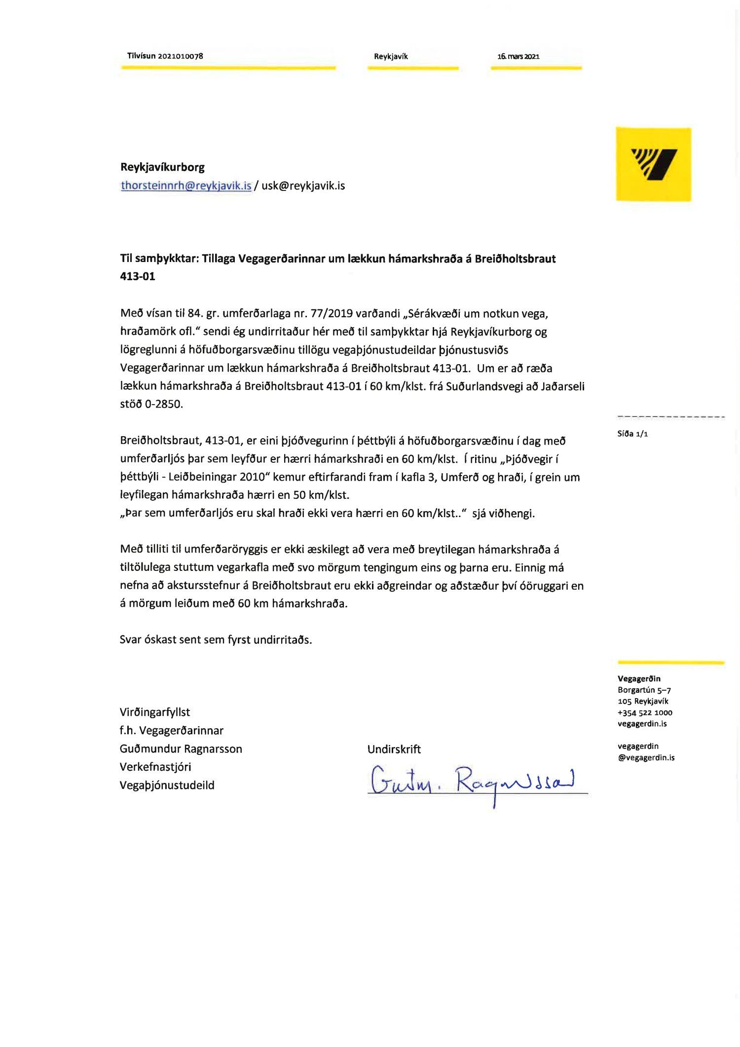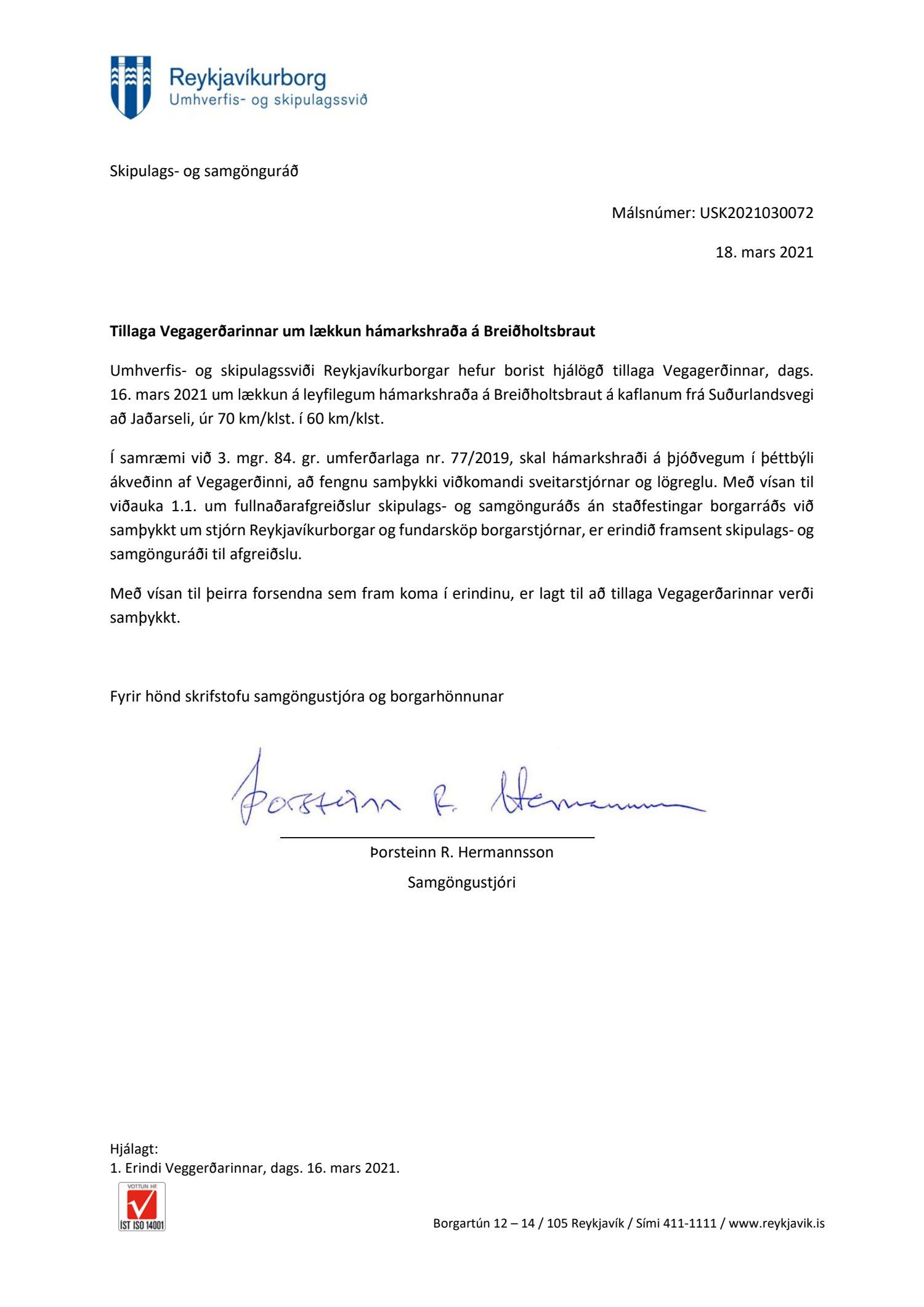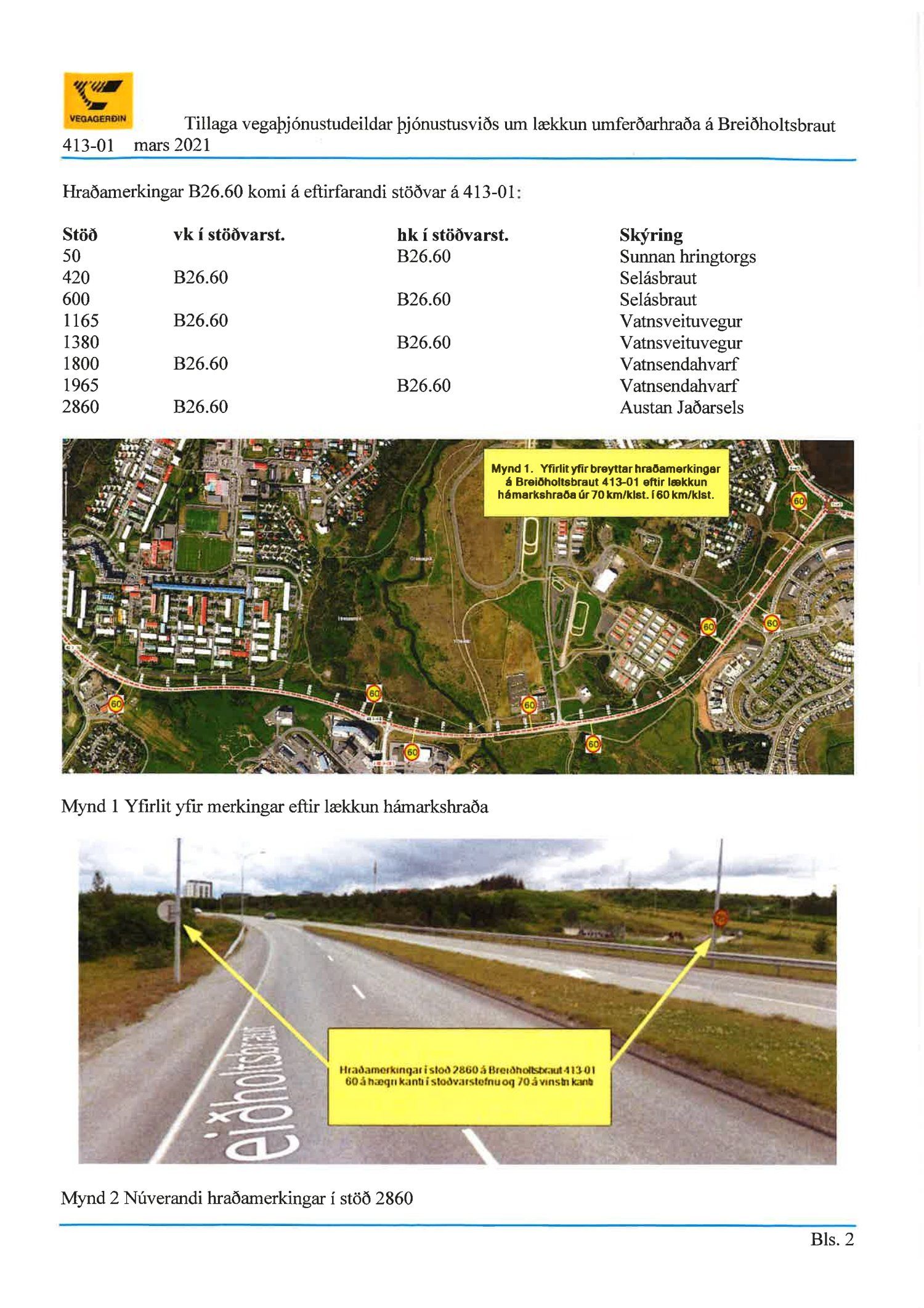 Lögð fram tillaga Vegagerðarinnar, dags. 16. mars 2021, um lækkun á leyfilegum hámarkshraða í 60 kílómetra á klukkustund á Breiðholtsbraut. Einnig er lögð fram umsögn skrifstofu samgöngustjóra og borgarhönnunar, dags. 18. mars 2021 þar sem lagt er til að skipulags- og samgönguráð samþykki tillögu Vegagerðarinnar.