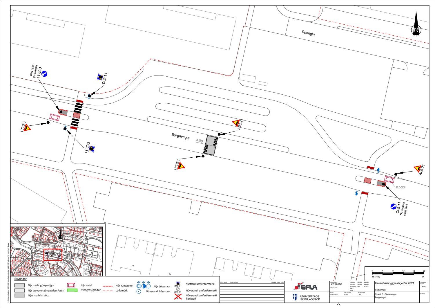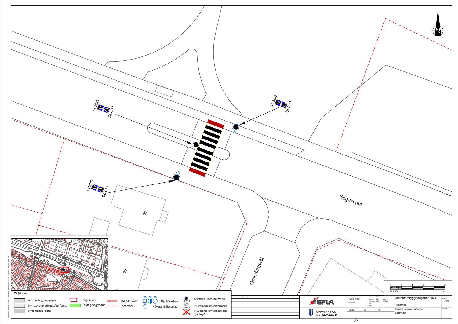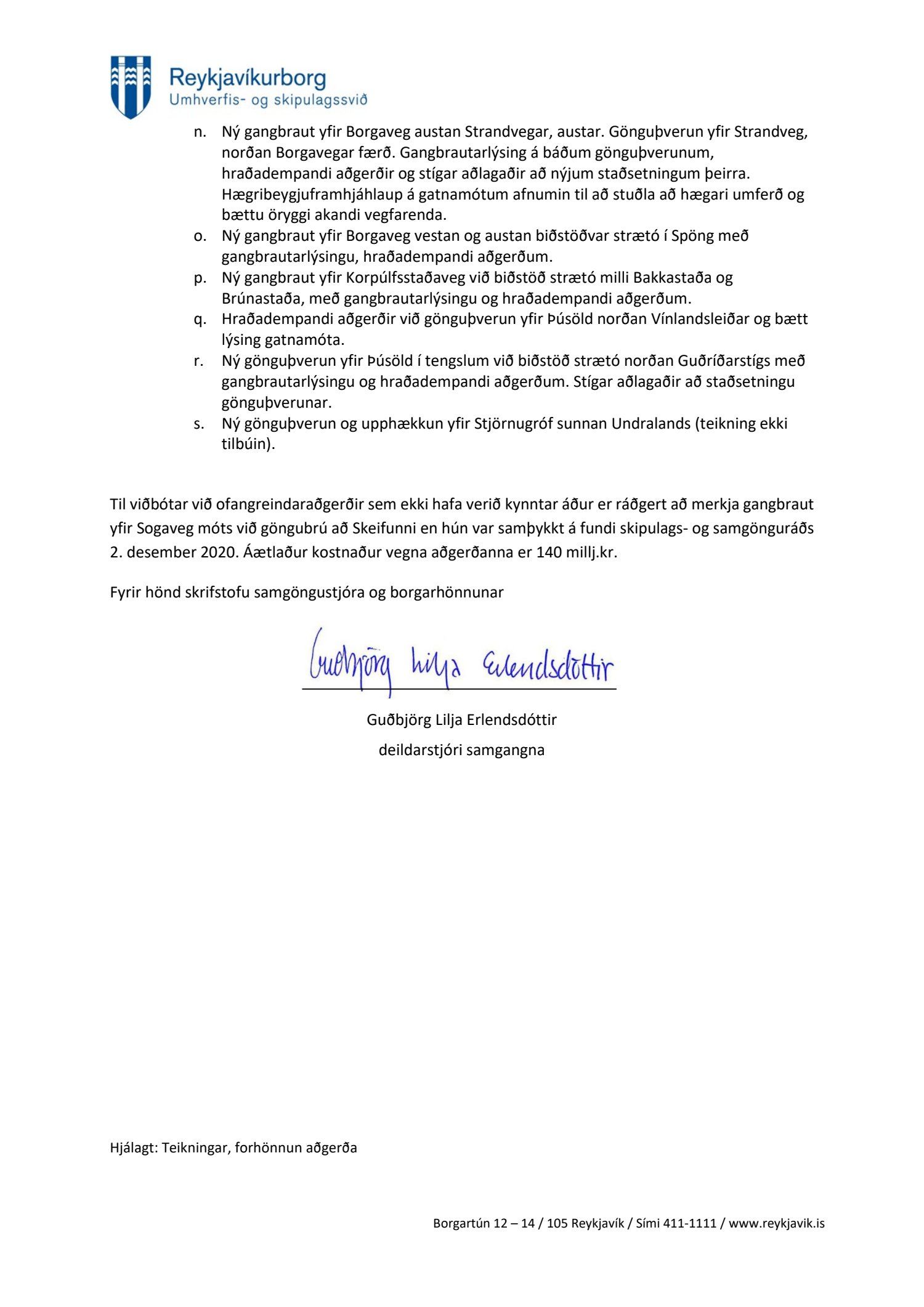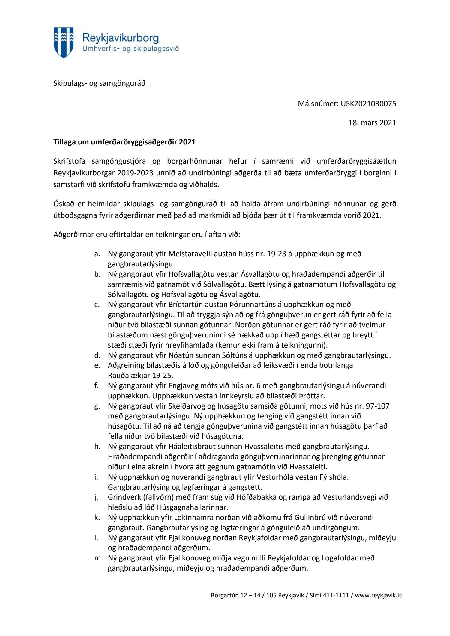 Óskað er heimildar skipulags- og samgönguráð til að halda áfram undirbúningi hönnunar og gerð útboðsgagna fyrir aðgerðirnar með það að markmiði að bjóða þær út til framkvæmda vorið 2021. Aðgerðirnar eru eftirtaldar en teikningar fylgja með tillögunni: a. Ný gangbraut yfir Meistaravelli austan húss nr. 19-23 á upphækkun og með gangbrautarlýsingu. b. Ný gangbraut yfir Hofsvallagötu vestan Ásvallagötu og hraðadempandi aðgerðir til samræmis við gatnamót við Sólvallagötu. Bætt lýsing á gatnamótum Hofsvallagötu og Sólvallagötu og Hofsvallagötu og Ásvallagötu. c. Ný gangbraut yfir Bríetartún austan Þórunnartúns á upphækkun og með gangbrautarlýsingu. Til að tryggja sýn að og frá gönguþverun er gert ráð fyrir að fella niður tvö bílastæði sunnan götunnar. Norðan götunnar er gert ráð fyrir að tveimur bílastæðum næst gönguþveruninni sé hækkað upp í hæð gangstéttar og breytt í stæði stæði fyrir hreyfihamlaða (kemur ekki fram á teikningunni). d. Ný gangbraut yfir Nóatún sunnan Sóltúns á upphækkun og með gangbrautarlýsingu. e. Aðgreining bílastæðis á lóð og gönguleiðar að leiksvæði í enda botnlanga Rauðalækjar 19-25. f. Ný gangbraut yfir Engjaveg móts við hús nr. 6 með gangbrautarlýsingu á núverandi upphækkun. Upphækkun vestan innkeyrslu að bílastæði Þróttar. g. Ný gangbraut yfir Skeiðarvog og húsagötu samsíða götunni, móts við hús nr. 97-107 með gangbrautarlýsingu. Ný upphækkun og tenging við gangstétt innan við húsagötu. Til að ná að tengja gönguþverunina við gangstétt innan húsagötu þarf að fella niður tvö bílastæði við húsagötuna. h. Ný gangbraut yfir Háaleitisbraut sunnan Hvassaleitis með gangbrautarlýsingu. Hraðadempandi aðgerðir í aðdraganda gönguþverunarinnar og þrenging götunnar niður í eina akrein í hvora átt gegnum gatnamótin við Hvassaleiti. i. Ný upphækkun og núverandi gangbraut yfir Vesturhóla vestan Fýlshóla. Gangbrautarlýsing og lagfæringar á gangstétt. j. Grindverk (fallvörn) með fram stíg við Höfðabakka og rampa að Vesturlandsvegi við hleðslu að lóð Húsgagnahallarinnar. k. Ný upphækkun yfir Lokinhamra norðan við aðkomu frá Gullinbrú við núverandi gangbraut. Gangbrautarlýsing og lagfæringar á gönguleið að undirgöngum. l. Ný gangbraut yfir Fjallkonuveg norðan Reykjafoldar með gangbrautarlýsingu, miðeyju og hraðadempandi aðgerðum. m. Ný gangbraut yfir Fjallkonuveg miðja vegu milli Reykjafoldar og Logafoldar með gangbrautarlýsingu, miðeyju og hraðadempandi aðgerðum. n. Ný gangbraut yfir Borgaveg austan Strandvegar, austar. Gönguþverun yfir Strandveg, norðan Borgavegar færð. Gangbrautarlýsing á báðum gönguþverunum, hraðadempandi aðgerðir og stígar aðlagaðir að nýjum staðsetningum þeirra. Hægribeygjuframhjáhlaup á gatnamótum afnumin til að stuðla að hægari umferð og bættu öryggi akandi vegfarenda. o. Ný gangbraut yfir Borgaveg vestan og austan biðstöðvar strætó í Spöng með gangbrautarlýsingu, hraðadempandi aðgerðum. p. Ný gangbraut yfir Korpúlfsstaðaveg við biðstöð strætó milli Bakkastaða og Brúnastaða, með gangbrautarlýsingu og hraðadempandi aðgerðum. q. Hraðadempandi aðgerðir við gönguþverun yfir Þúsöld norðan Vínlandsleiðar og bætt lýsing gatnamóta. r. Ný gönguþverun yfir Þúsöld í tengslum við biðstöð strætó norðan Guðríðarstígs með gangbrautarlýsingu og hraðadempandi aðgerðum. Stígar aðlagaðir að staðsetningu gönguþverunar. s. Ný gönguþverun og upphækkun yfir Stjörnugróf sunnan Undralands (teikning ekki tilbúin). Til viðbótar við ofangreindaraðgerðir sem ekki hafa verið kynntar áður er ráðgert að merkja gangbraut yfir Sogaveg móts við göngubrú að Skeifunni en hún var samþykkt á fundi skipulags- og samgönguráðs 2. desember 2020. Áætlaður kostnaður vegna aðgerðanna er 140 millj.kr.