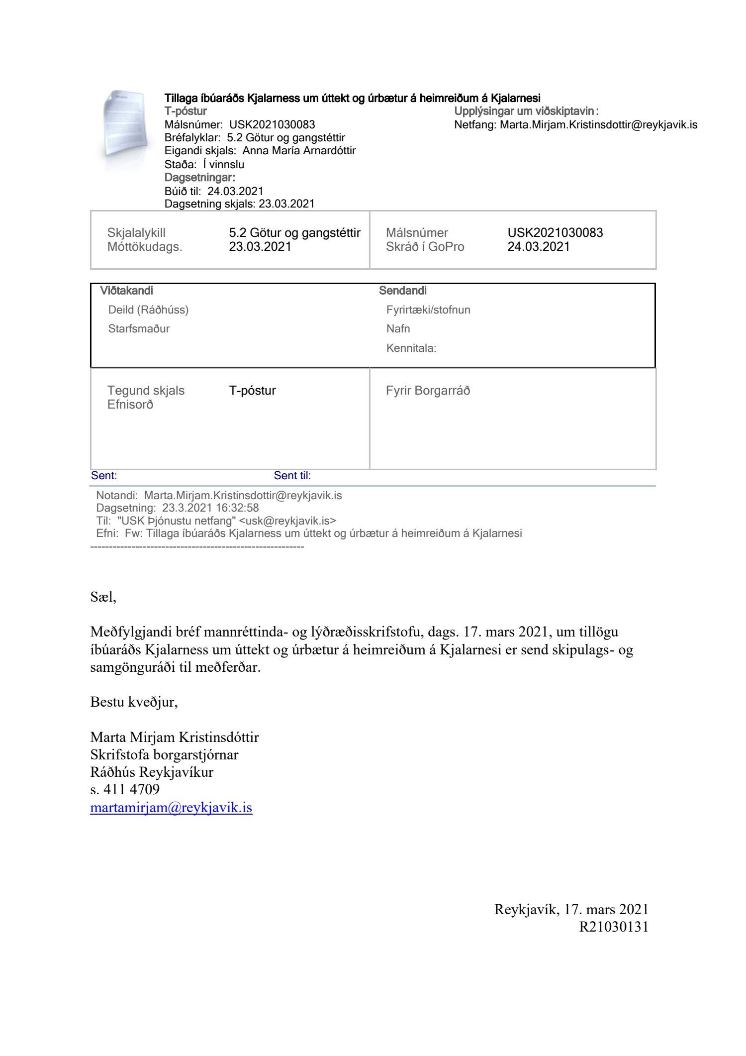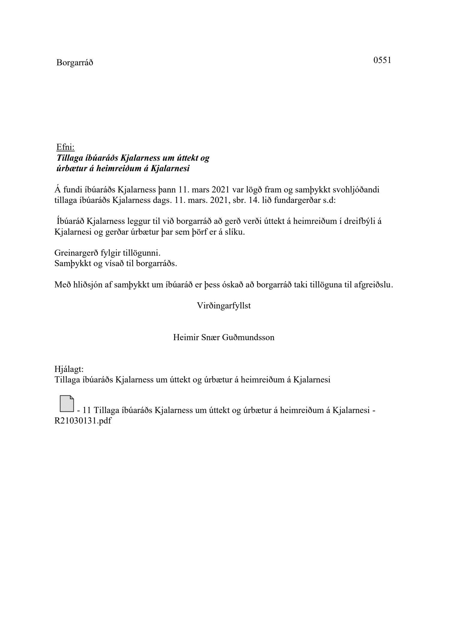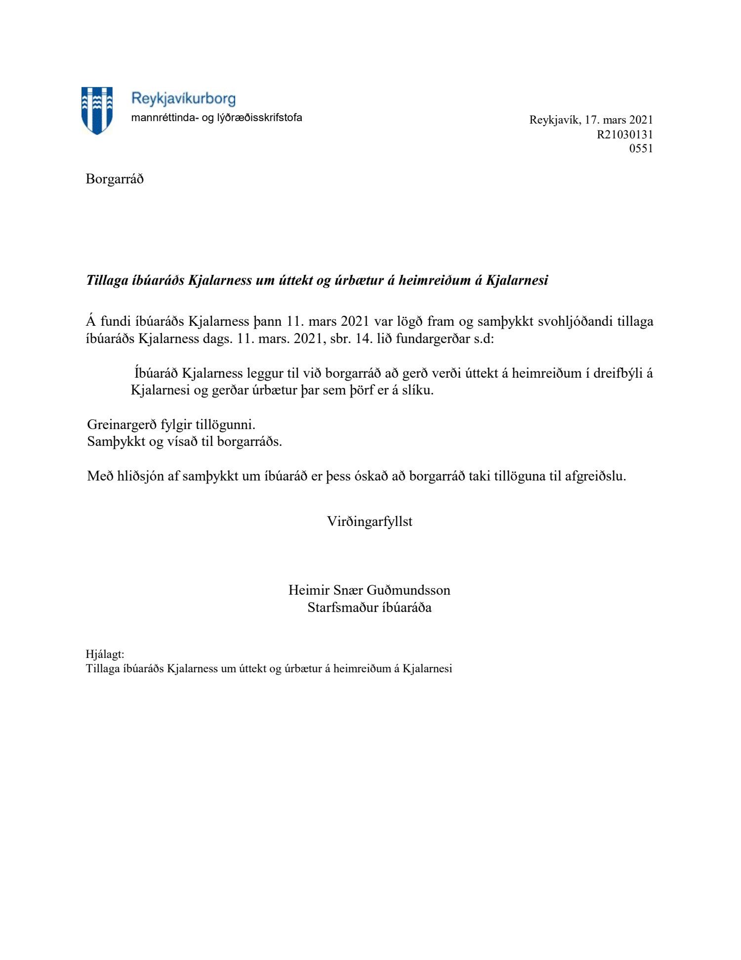 Lögð er fram tillaga íbúaráðs Kjalarness sem send var til meðferðar borgarráðs með bréfi mannréttinda- og lýðræðisskrifstofu dags. 17. mars 2021. Tillagan var send til meðferðar skipulags- og samgönguráðs þann 23. mars 2021 og er svohljóðandi: