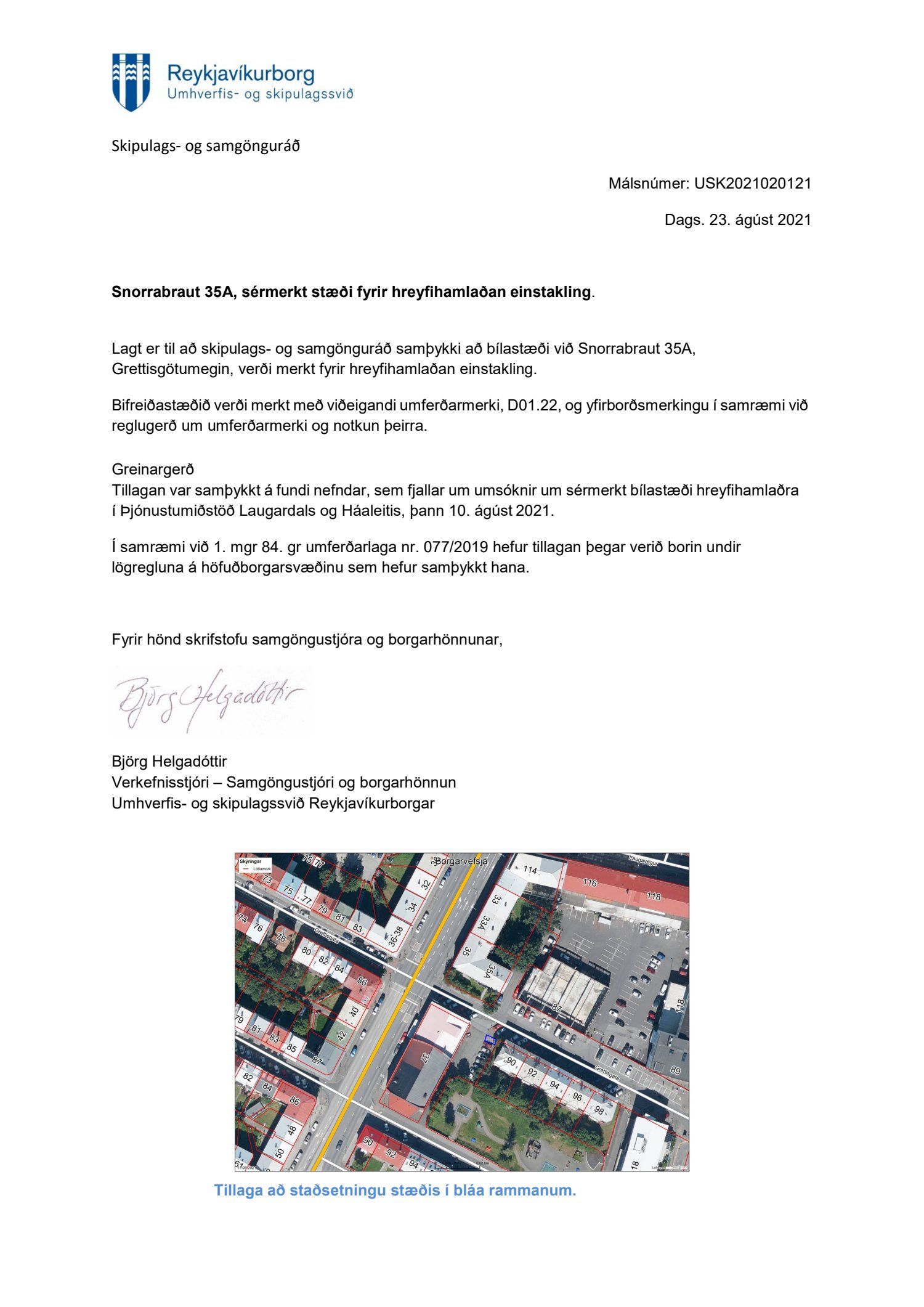 Lagt fram bréf umhverfis- og skipulagssviðs, skrifstofu samgöngustjóra og borgarhönnunar dags. 23. september 2021 þar sem lagt er til að skipulags- og samgönguráð samþykki að bílastæði við Snorrabraut 35A, Grettisgötumegin, verði merkt fyrir hreyfihamlaðan einstakling.